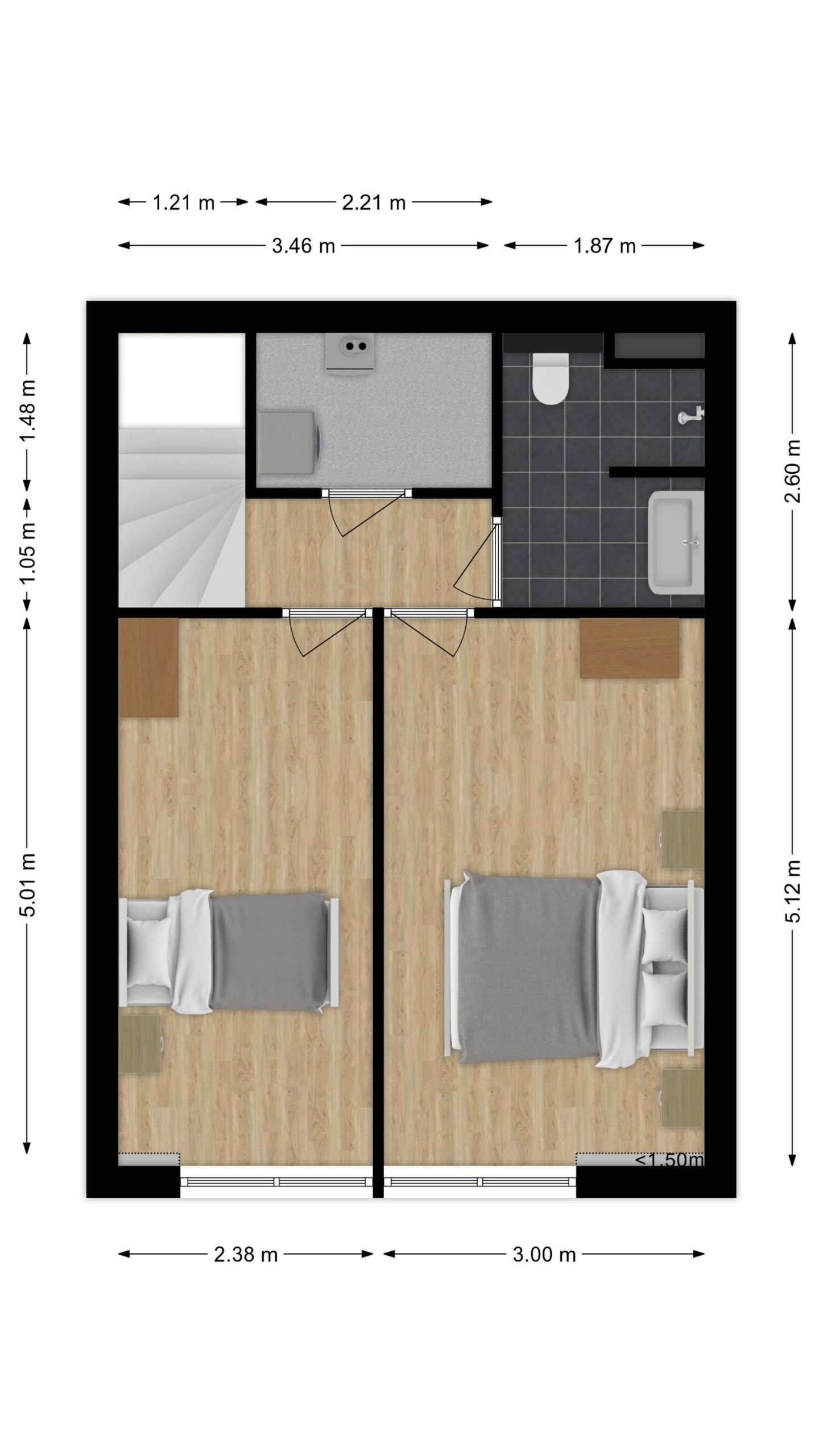Via de open trap in de woonkamer komt u op de verdieping met ruime overloop, vanwaar er toegang is tot 2 ruime slaapkamers en de badkamer met inloopdouche, wastafelmeubel, wandcloset en handdoekradiator. Tevens is er op deze verdieping een handige berging met opstelplaats cv-ketel (Intergas, 2018), wasmachine- en drogeraansluiting, wtw unit en omvormer voor de zonnepanelen.