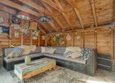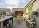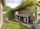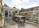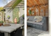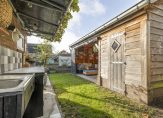 De tuin is met zorg aangelegd en biedt meerdere fijne plekken om te zitten. De overkapping met tv-aansluiting is afsluitbaar met zeil, waardoor je hier ook in de koudere maanden comfortabel kunt zitten. Achter in de tuin bevinden zich een berging, schuur en een buitenkeuken, ideaal voor wie graag buiten kookt of gasten ontvangt.