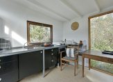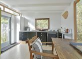 Binnen treft u een sfeervolle woonkamer met vaste kasten, een open keuken en openslaande deuren naar de zonnige tuin met vlonderterras. De houtkachel zorgt voor extra warmte en gezelligheid. Er is slaapruimte en een apart toilet met wastafel.