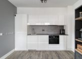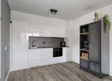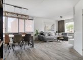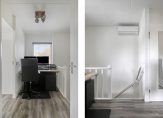 Via de buitentrap bereik je de entree op de eerste verdieping. Hier kom je binnen in de hal met vernieuwde meterkast, moderne toiletruimte met wandcloset en fontein, trapopgang naar de verdieping, praktische trapkast en toegang tot de woonkamer met open keuken. De lichte woonkamer is strak afgewerkt met een moderne PVC vloer. Vanuit de woonkamer stap je zo het balkon op, waar je heerlijk kunt zitten met uitzicht over de straat. De open keuken is voorzien van een moderne keukeninrichting voorzien koelkast, vrieskast, inductie kookplaat, afzuigkap, combi-oven/magnetron en vaatwasser. De ruime opzet zorgt voor een prettige leefruimte met plek voor een grote eettafel.