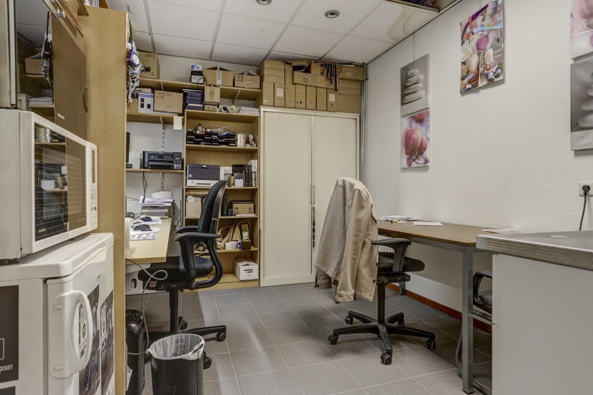 Kantoorruimte voorzien van tegelvloer, systeemplafond met inbouwspots. In de kantoorruimte bevindt zich een eenvoudig keukenblok met boven- en onderkastjes en een spoelbak.