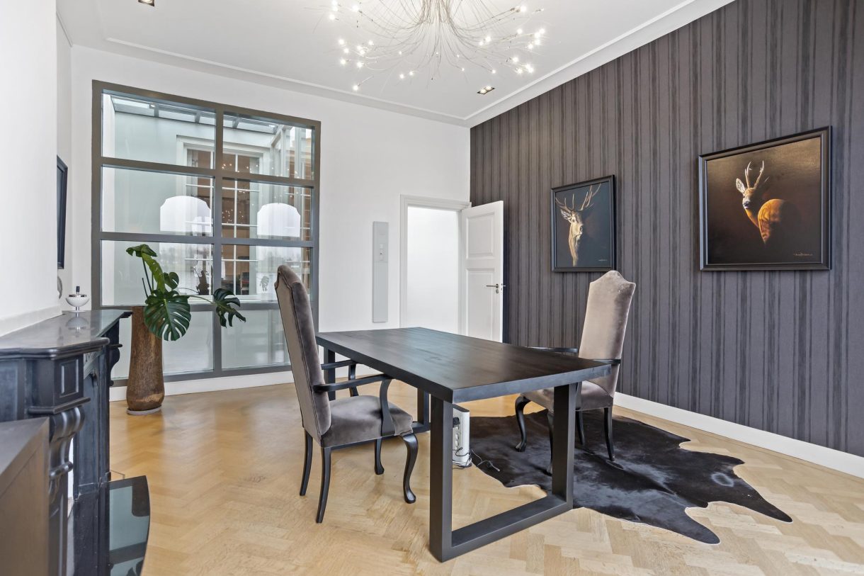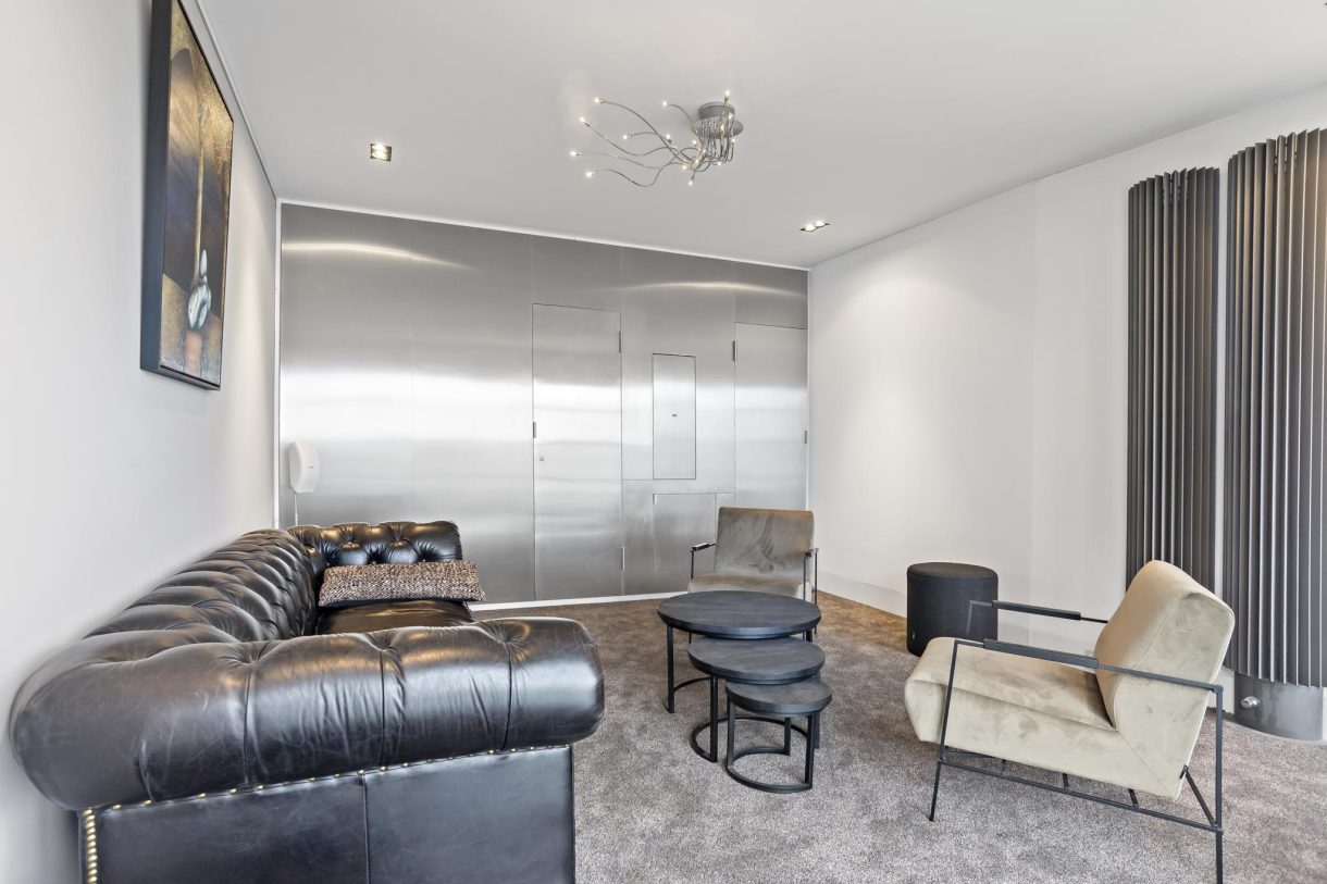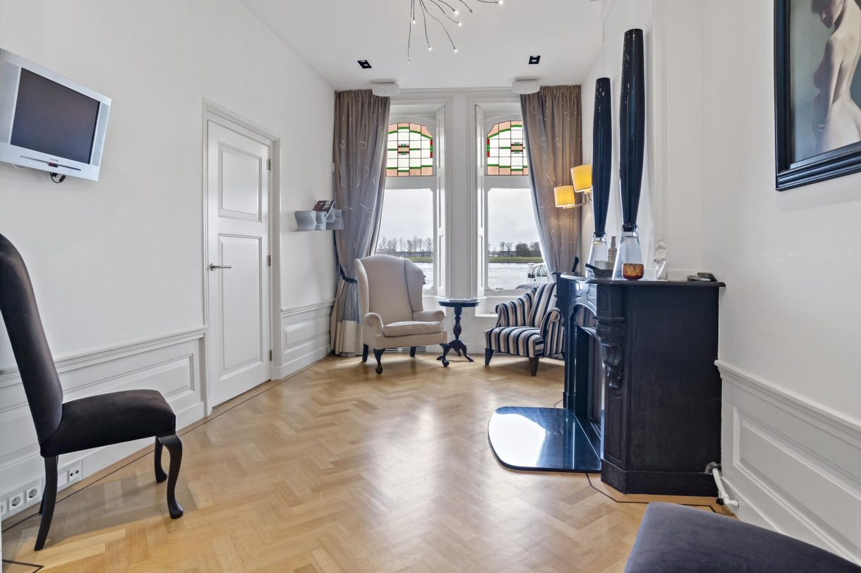 Voorts zwevende houten trap naar de 1e etage, imposante vergaderruimte aan de achterzijde ca. 6.63×3.94 voorzien van robuuste vergadertafel, rvs wand en aan de voorzijde bevindt zich de directiekamer ca. 5.33×4.29 met weids uitzicht over de rivier en eveneens voorzien van zwart natuurstenen schouw, ornamenten plafonds en lcd scherm. Ook deze verdieping bestaat uit een perfecte combinatie tussen klassieke en moderne architectuur wat terugkomt in de visgraat parketvloer, de glazen vloer en design radiatoren en armaturen.