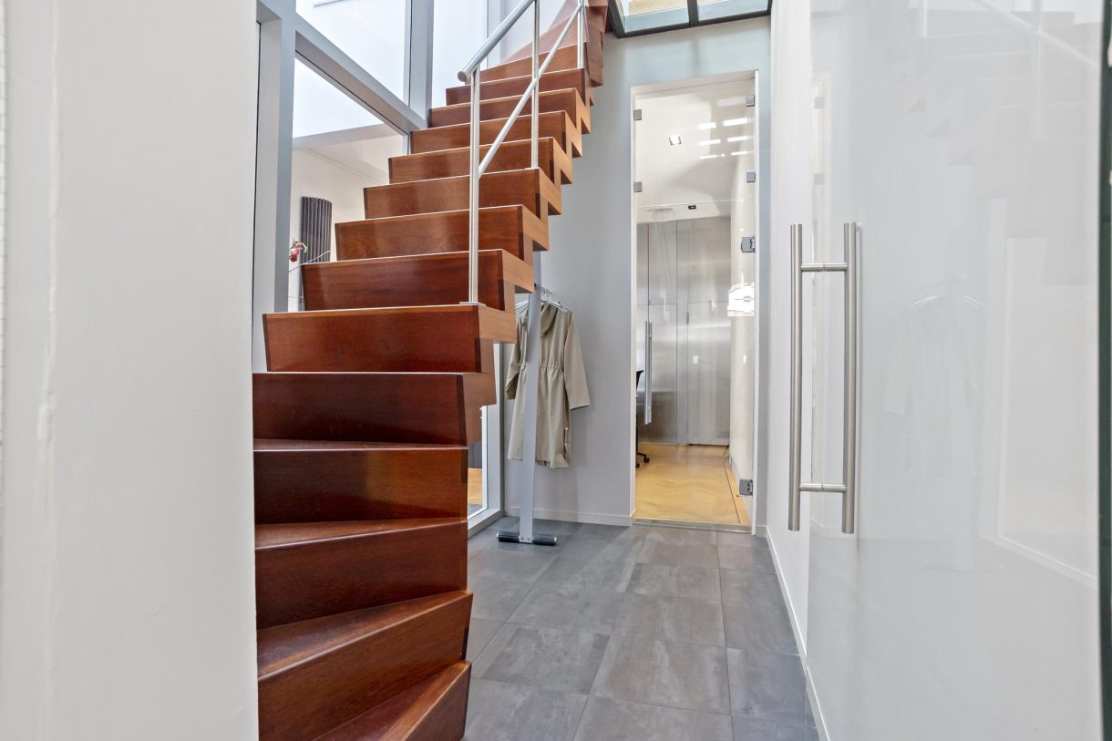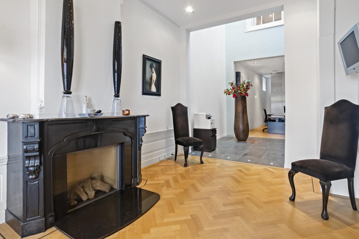 Entree met marmeren vloeren en wanden, garderobe, voormalige receptie ca. 4.31×3.92 en geschikt voor 2 werkplekken, rvs kastenwand, apart toilet en kitchenette met luxe “Miele” inbouwapparatuur, voorts gecreëerd atrium ca. 3.35×2.41 hetwelk compleet is doorgebroken tot de topetage met een schitterende lichtinval, verder op de begane grond een ontvangstruimte ca. 5.16×3.09 voorzien van lcd scherm en zwart natuurstenen schouw met gashaard. De begane grond is voorzien van visgraat parket, natuurstenen plavuizen met ledverlichting, design radiatoren en armaturen en sfeervolle wand- en plafondverlichting.
