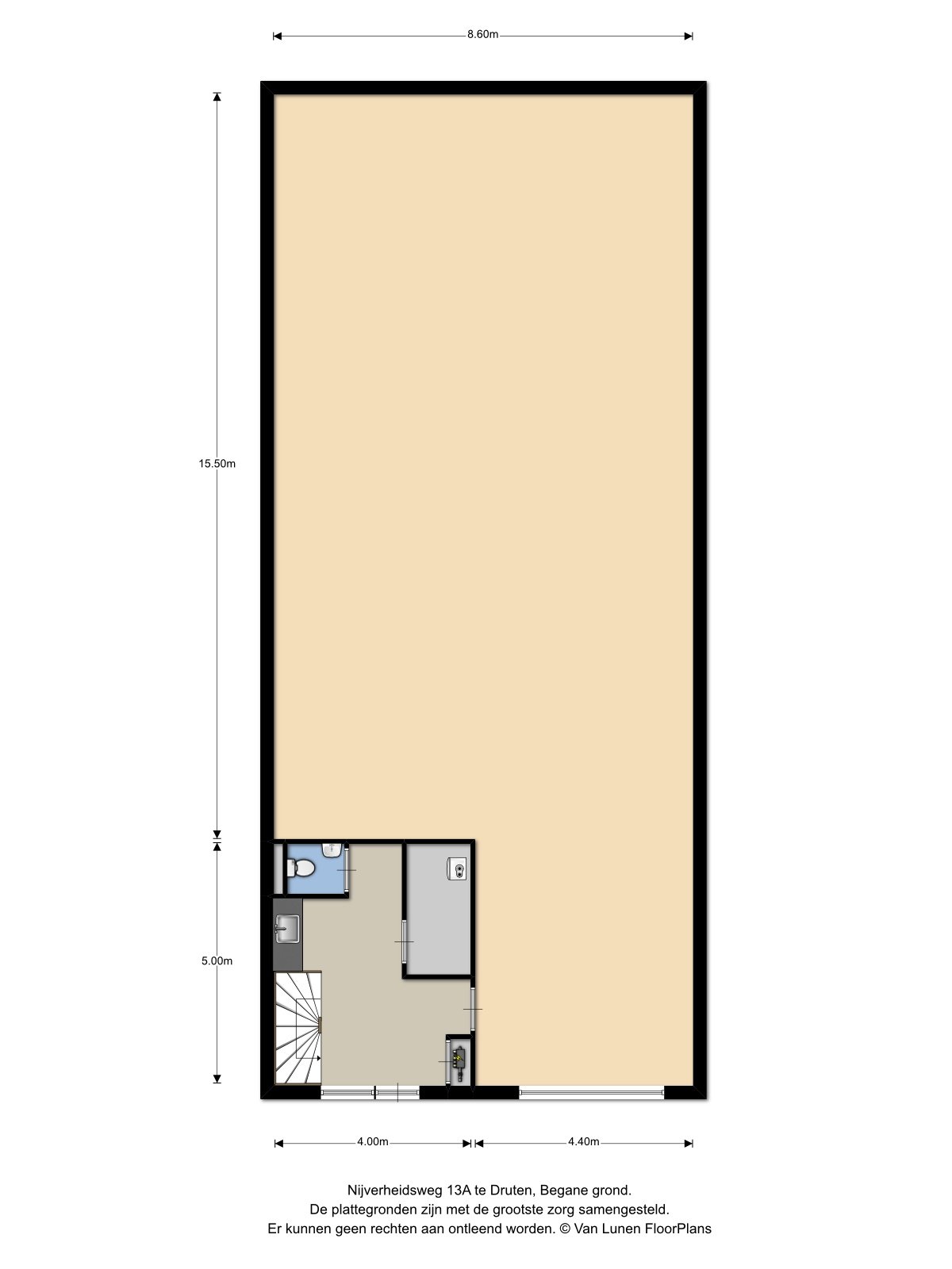 De hal op de begane grond is 156 m² groot, voorzien van een overheaddeur. Op de 1e etage bevindt zich een showroom of opslagruimte van ca. 133 m².