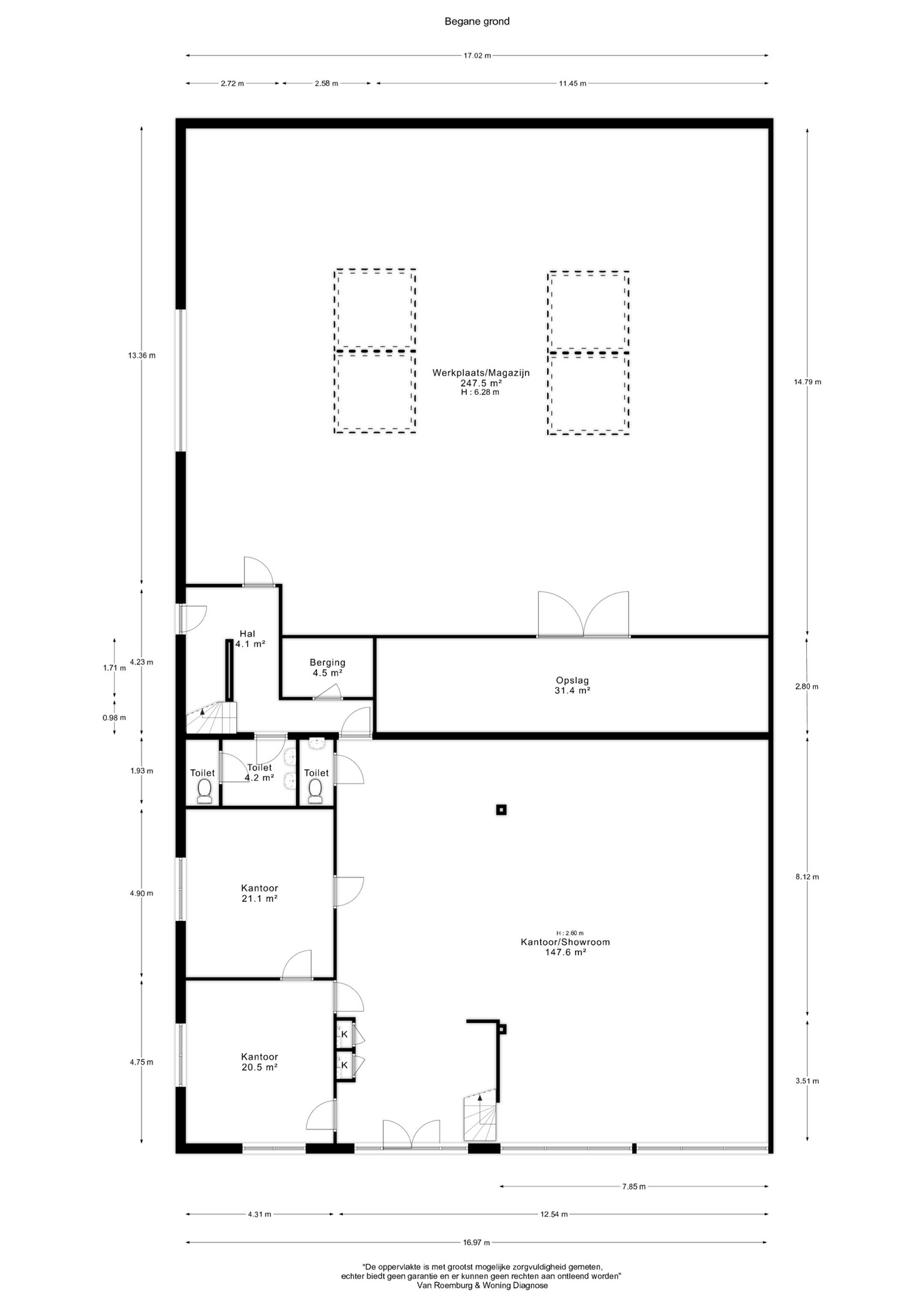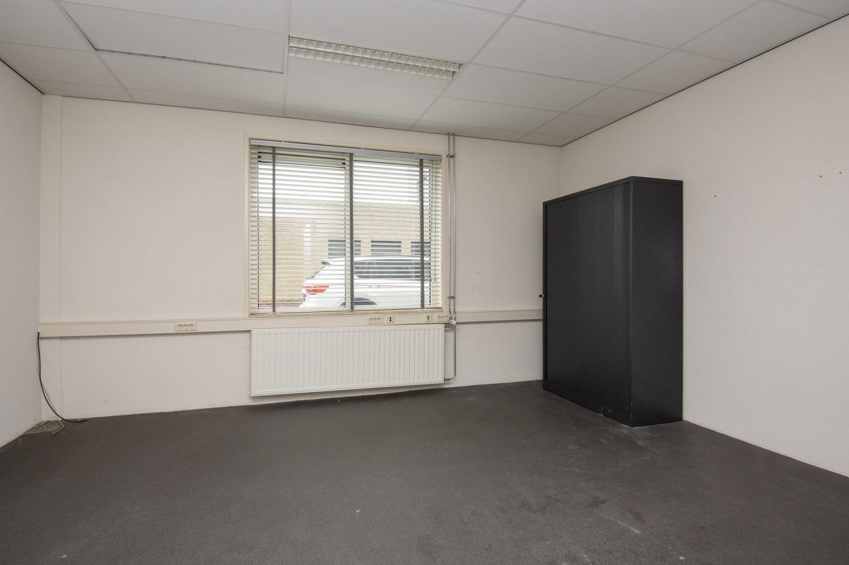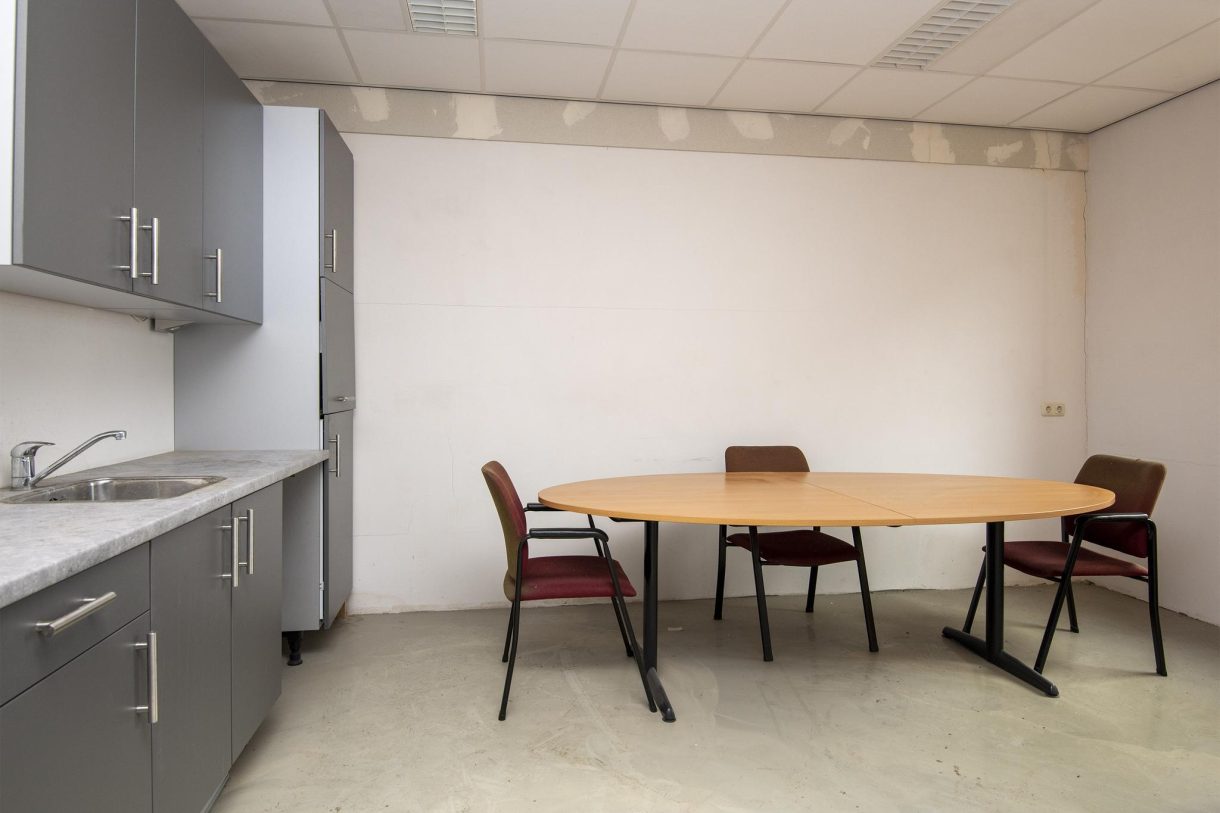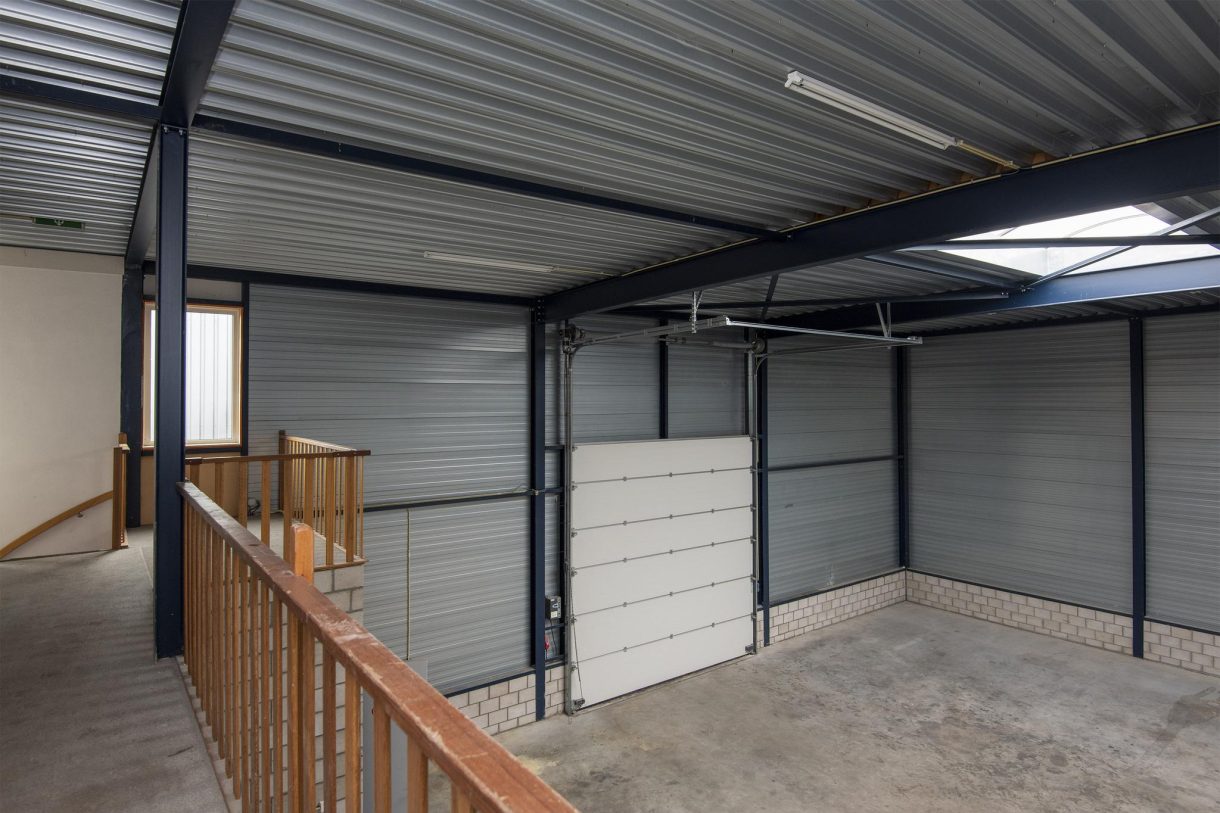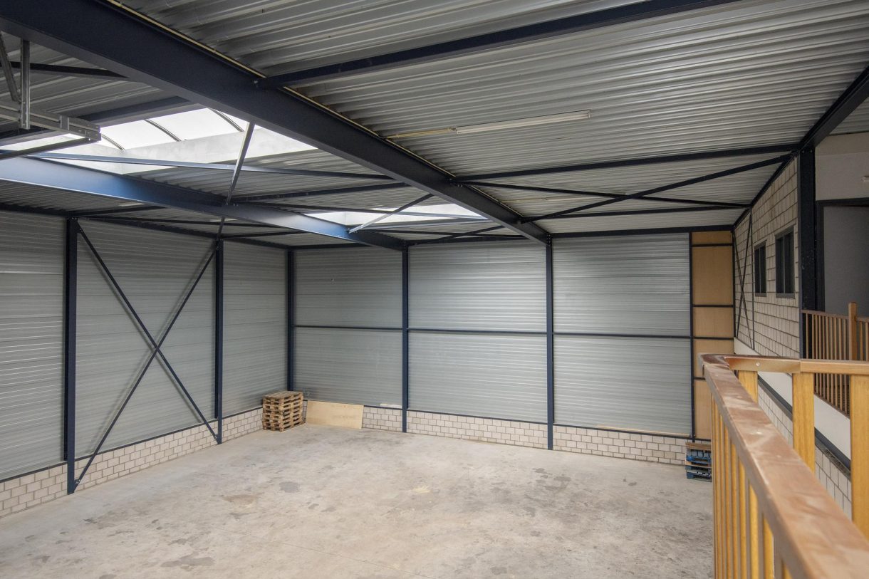 Aan de achterzijde is een ruim magazijn of werkplaats gelegen met een verhuurbare vloer oppervlakte (V.V.O.) van plm. 248 m2 en een vrije hoogte van ruim 6 meter, alsmede een gedeelte opslag ter grootte van plm. 40 m2. Voorzien van een grote elektrische expeditiedeur. Vanuit het magazijn is via een trap de vide op de eerste verdieping te bereiken, die toegang geeft tot de kantine/pantry en een tweetal opslagruimten. De verdieping heeft een oppervlakte van plm. 85 m2.
