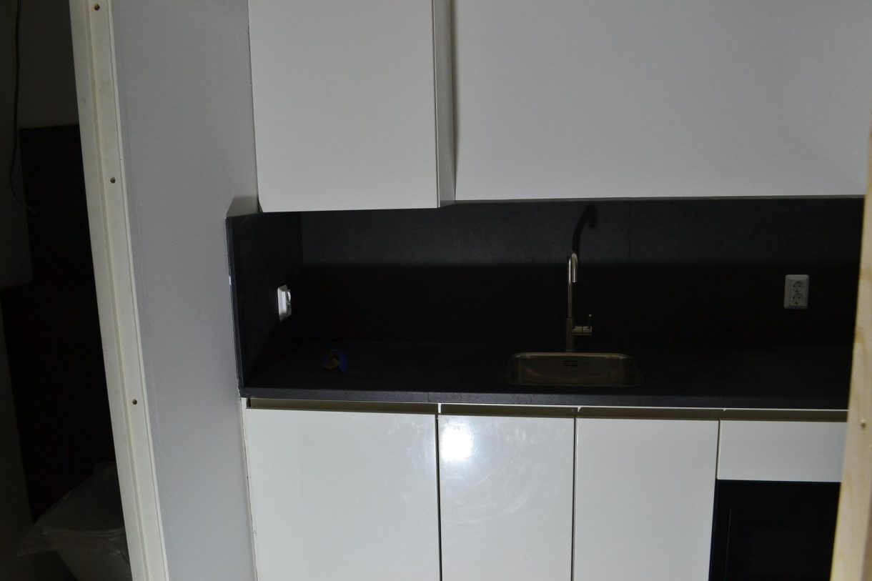 In de huidige staat met o.a. strak afgewerkte muren en plafond, inclusief keukenblok en sanitair.