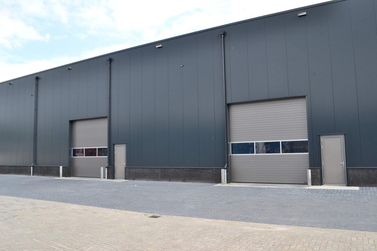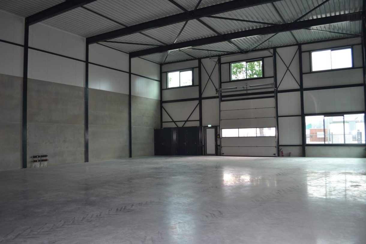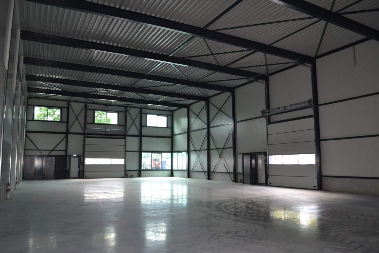 De bedrijfshal voorzien van 3 elektrisch bedienbare overheaddeuren met een afmeting van 4.50 m1 x 4.50 m1, zware, stofvrije betonvloer, en krachtstroom.