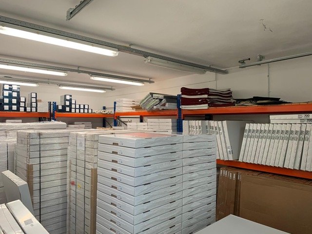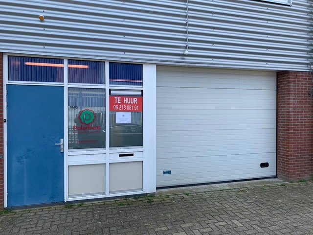 Bedrijfsruimte met overheaddeur en voorzien van TL verlichting.