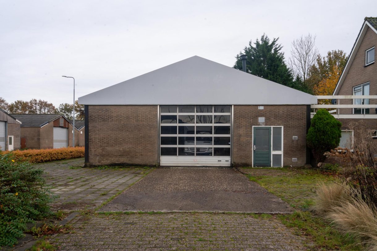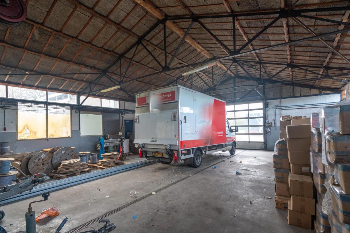 Bedrijfsruimte van ca. 18mx12m, nokhoogte van ca. 5.5m/goothoogte ca. 3.75m, v.v. betonvloer en diverse raampartijen, toegang middels een elektrische overheaddeur van 4mx3.5m en een aparte loop-deur.