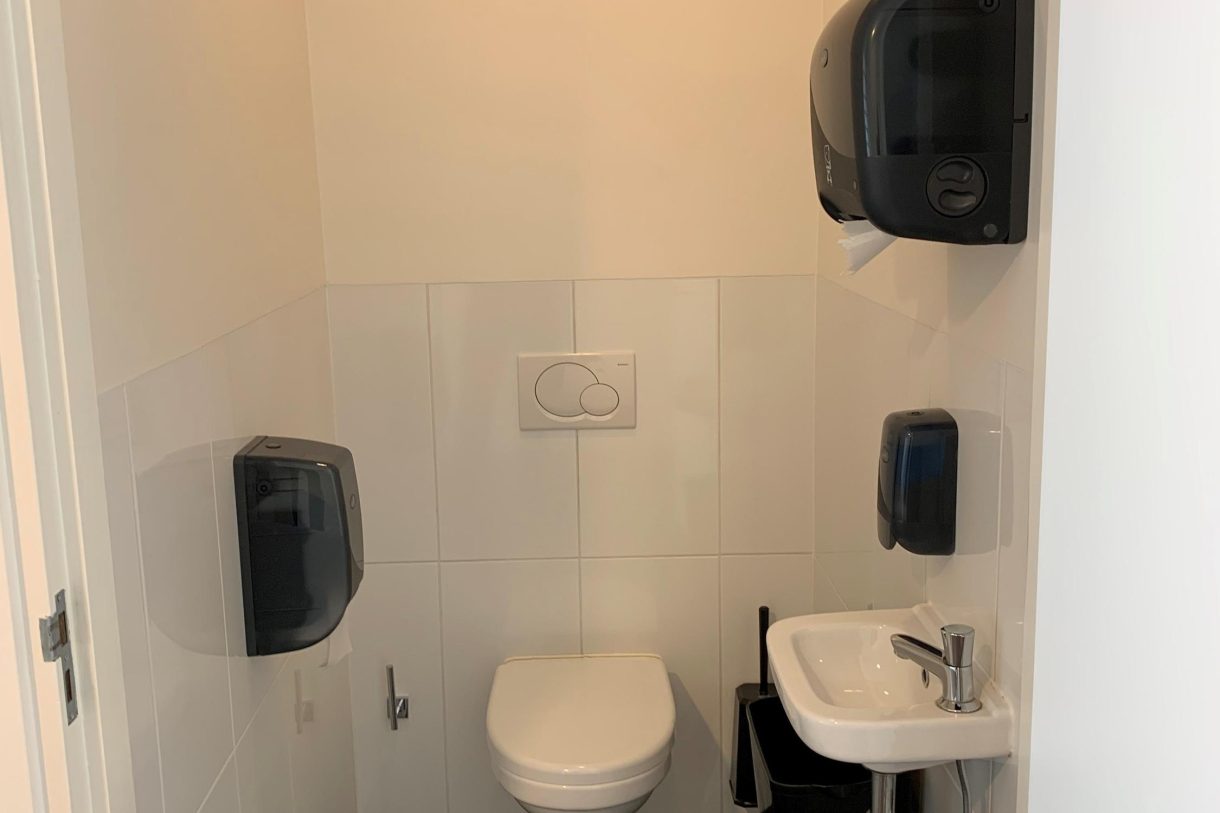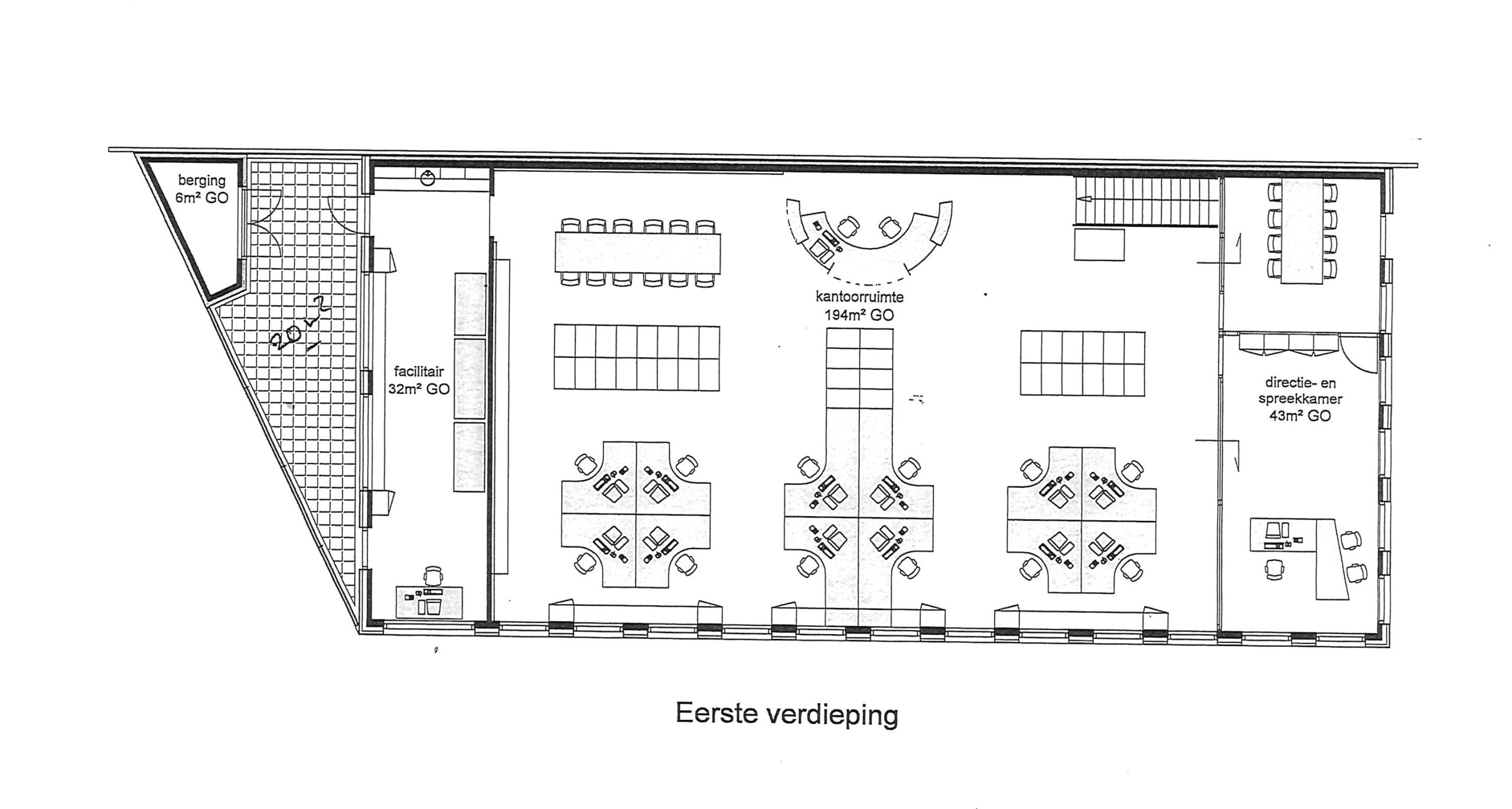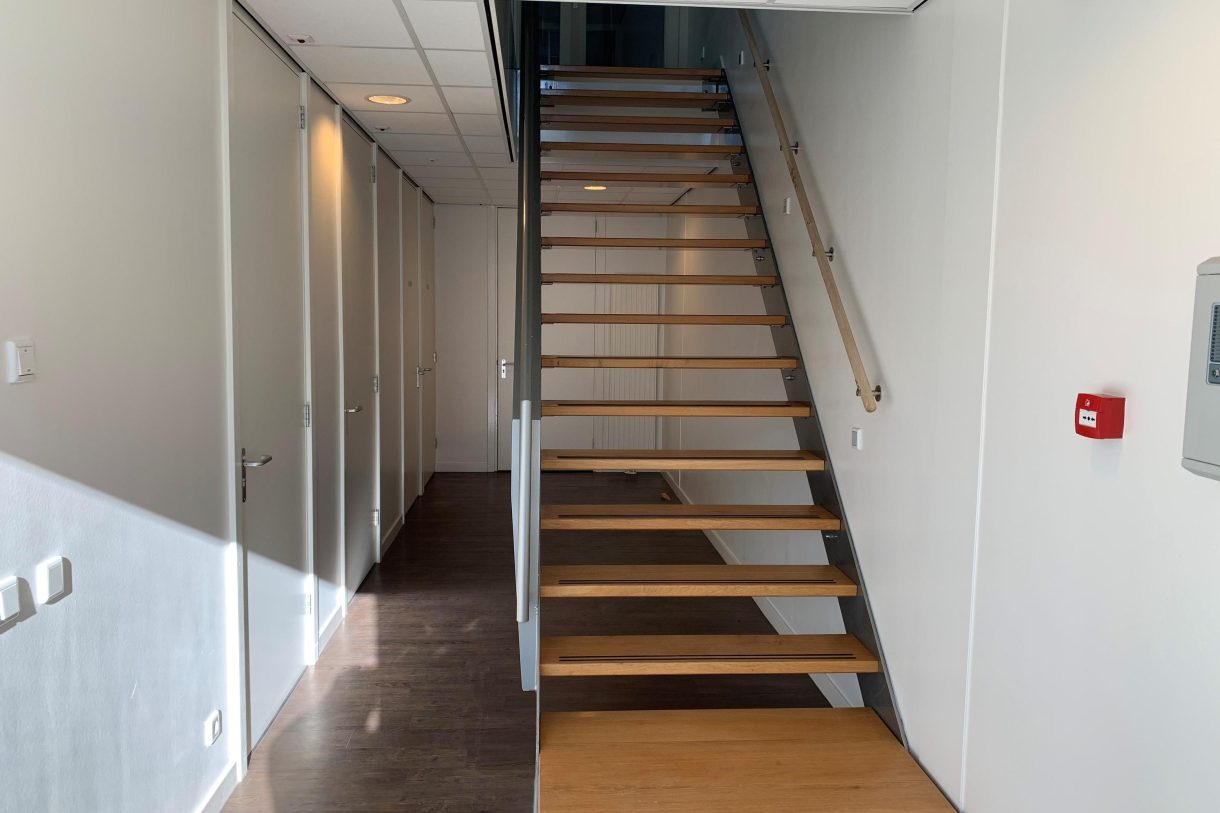 In de Centrale entree op de begane grond bevind zich een werkkast en 2 separate toiletten. Via de trap bereikt u de verdieping met grote kantoorruimte van 194 m2 met 2 naastgelegen separate kantoorruimten en een achtergelegen pantry-ruimte met toegang tot een dakterras.