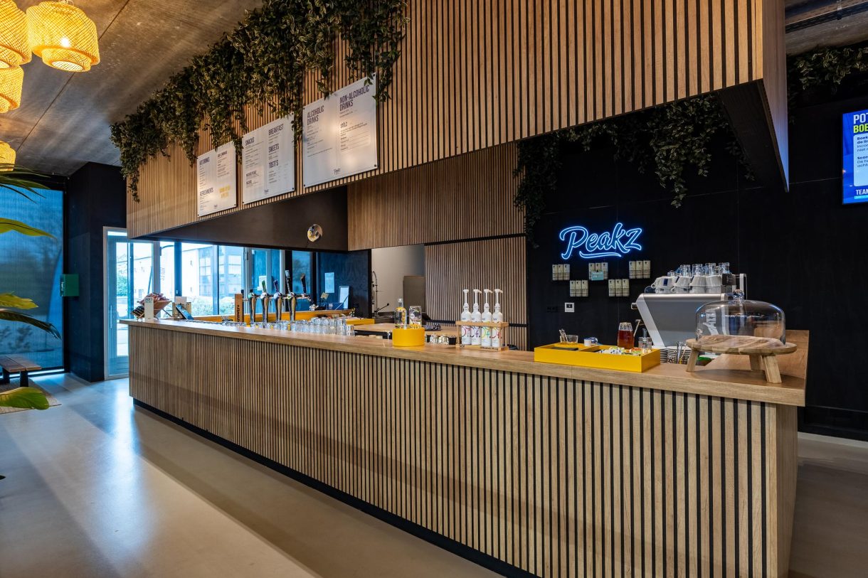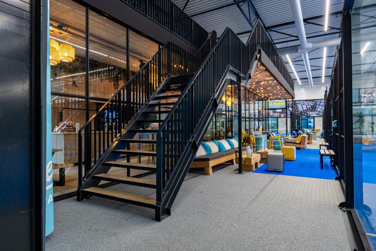 Er is een grote parkeerplaats voor het pand. Beneden is er horecaruimte en speelvelden van het padelcentrum.