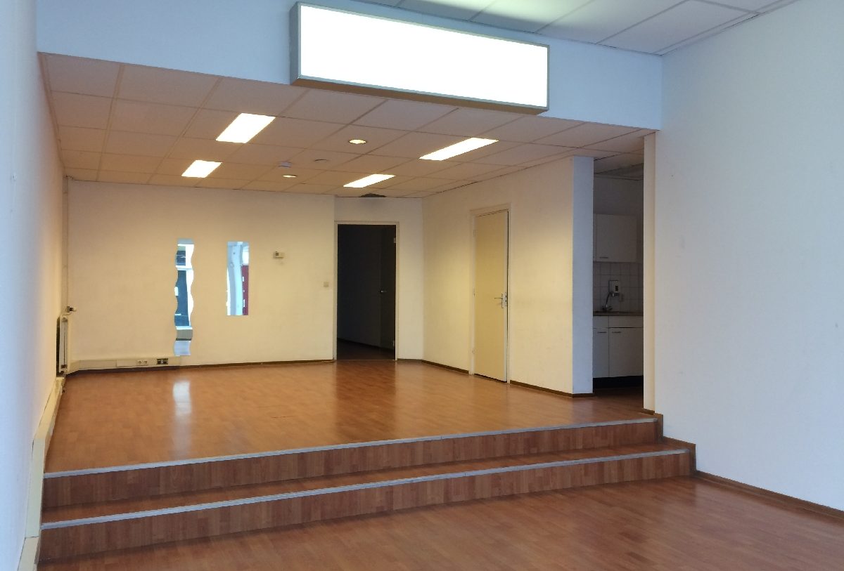 De ruimte is ca. 122 m² groot en bestaat uit een ruime winkelruimte met veel licht en openheid, een toiletgroep, een pantry maar ook nog een drietal (spreek)kamers van 9 m2, 11 m2, en 22 m2 en een technische ruimte met de centrale verwarming. Tevens is er een kelderruimte. Afwerking: systeemplafonds, glasvlieswanden, en een laminaatvloer.