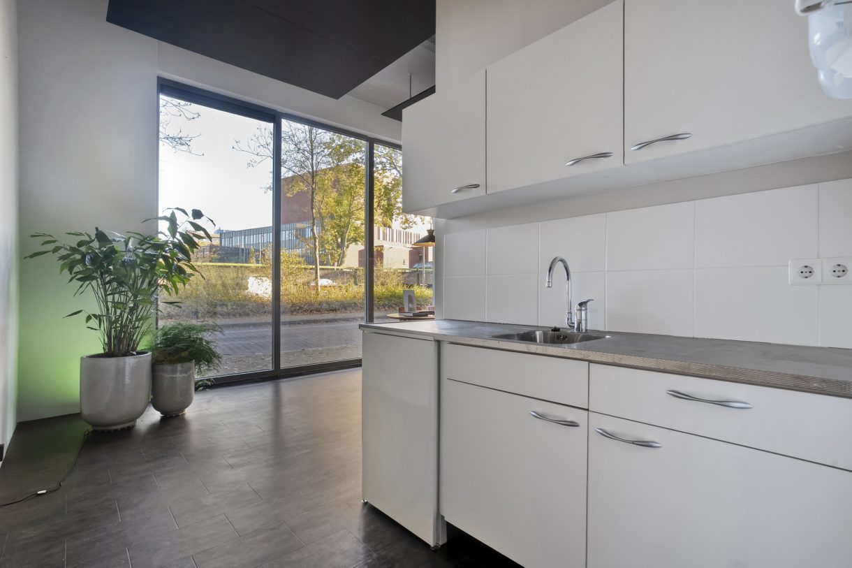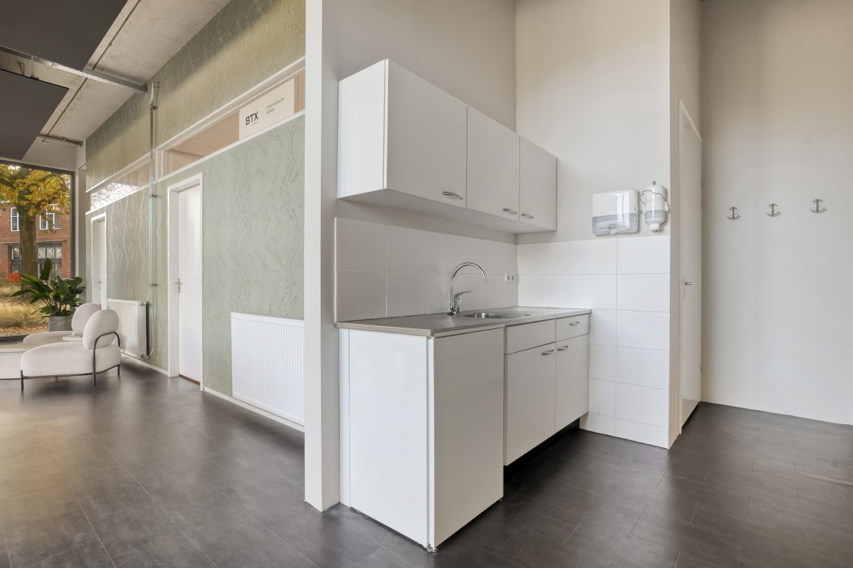 Via de entree kom je in een mooie open ruimte met veel raampartijen. Aan de linkerkant zijn twee afsluitbare ruimtes aanwezig. Er is een pantry aanwezig en een toilet.