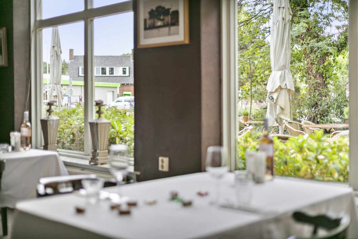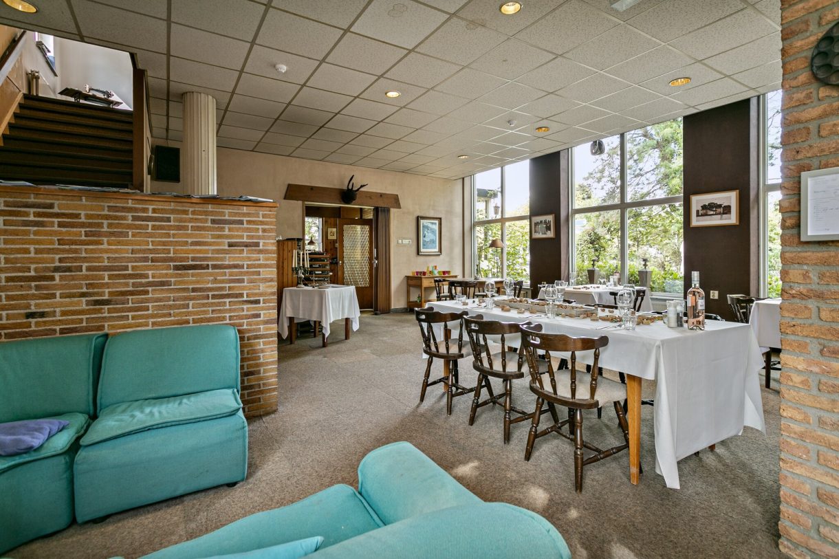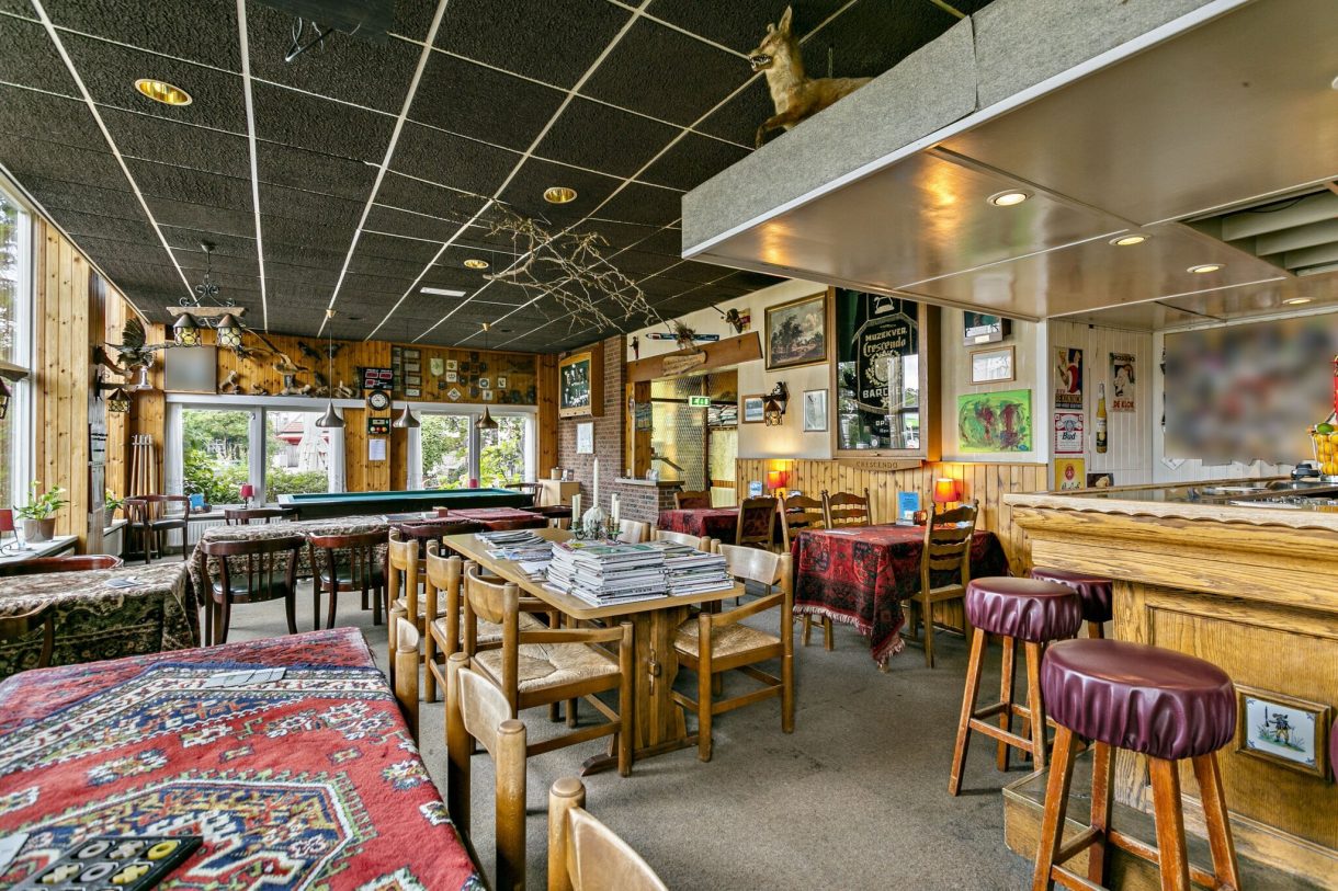 Via het terras aan de voorzijde kom je bij de entree van het café/restaurant. Aan de linkerkant is de grote eetzaal met een trap naar de bovenverdieping en de toegang tot de aangrenzende bedrijfskeuken. Aan de rechterzijde is het café met een karakteristieke bar en het biljart. Tussen het café en de eetzaal zijn het heren- en damestoilet met een portaal.