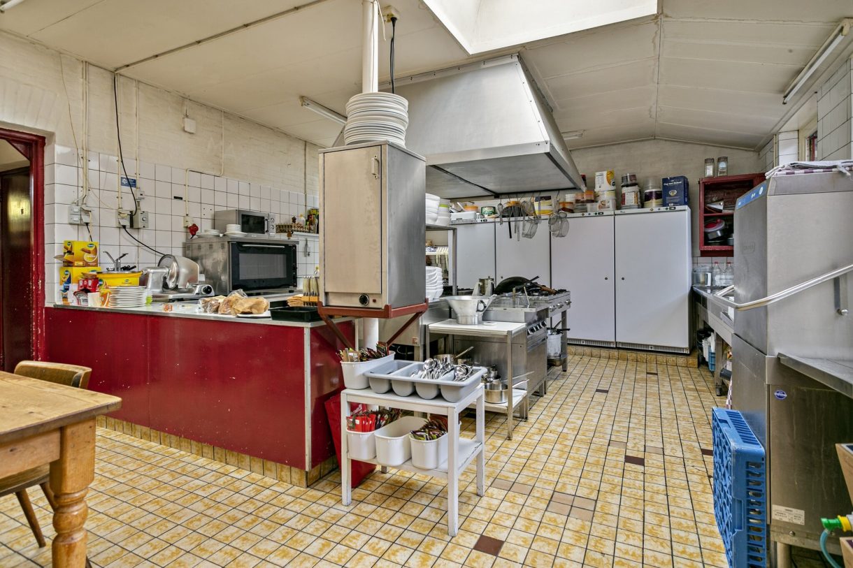 De bedrijfskeuken is qua maatvoering groot genoeg om voor een grote groep mensen een buffet of à la carte eten te bereiden. Achter de keuken is een bijkeuken, ook is vlak naast de keuken de trap naar de stahoge kelder. Aan de andere kant, bij het café, is een kantoorruimte.