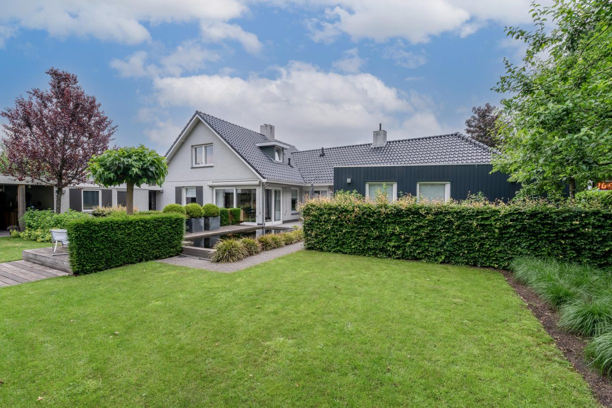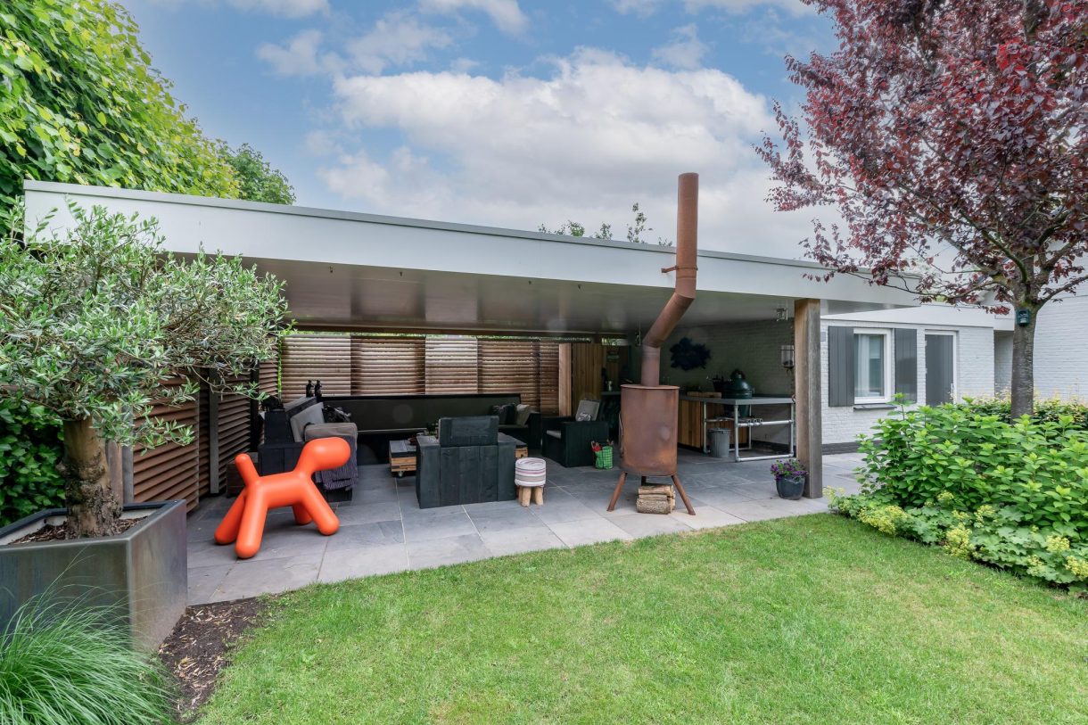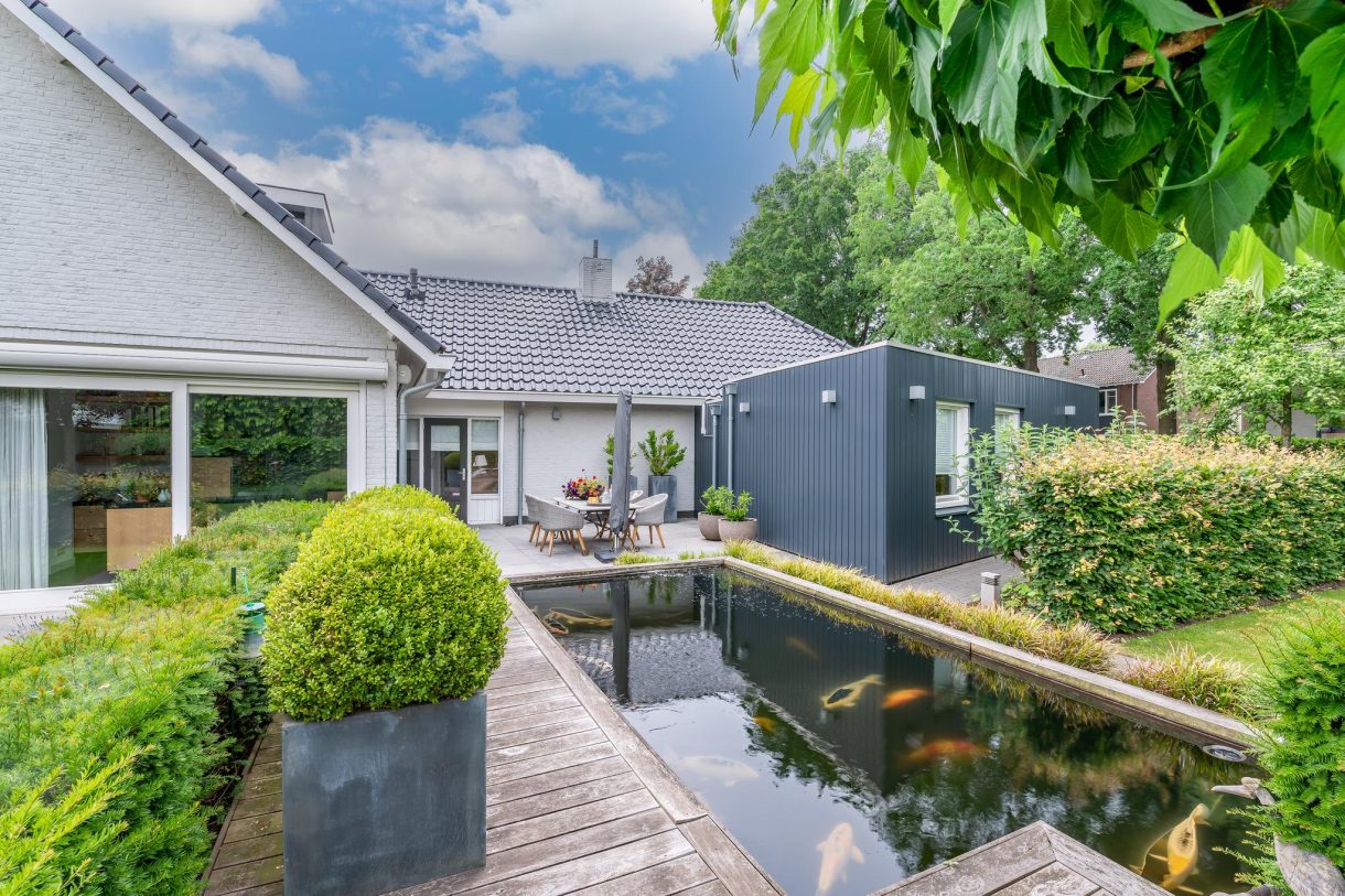 Tuin: Prachtig aangelegde tuin met terrassen, vijver geschikt voor Koi karpers en een zeer royale terrasoverkapping met buitenkeuken. De tuin biedt toegang aan de garage en de carport.