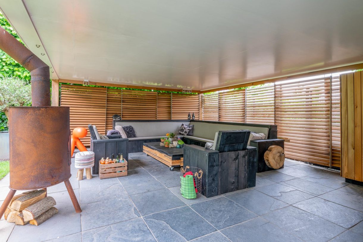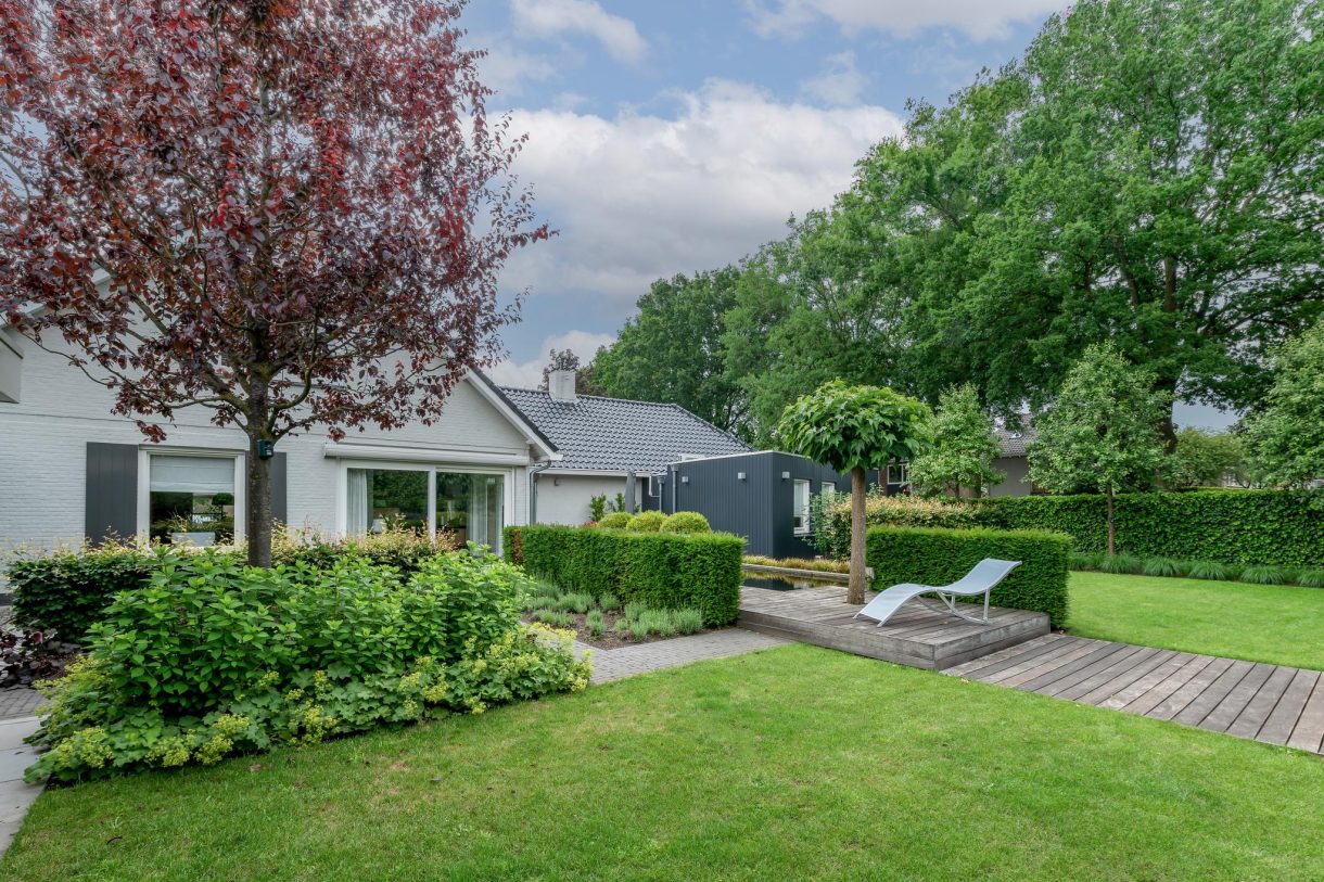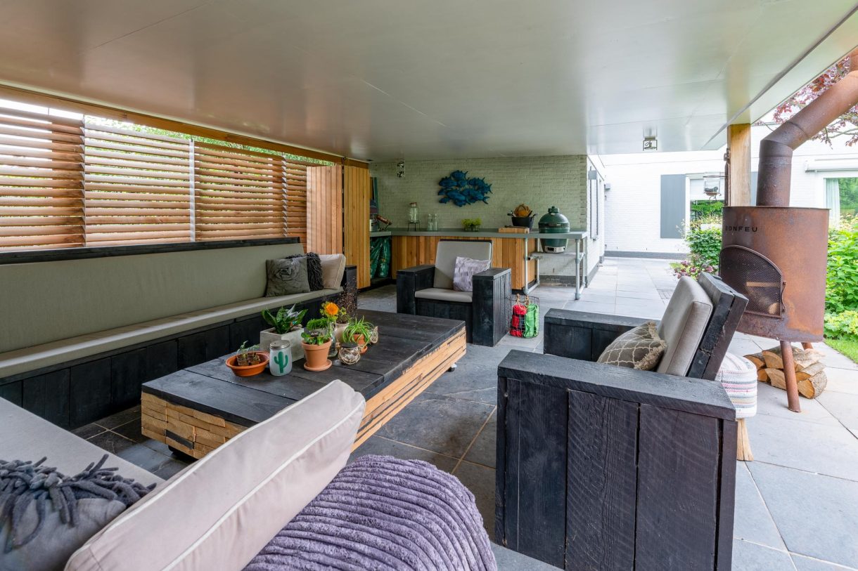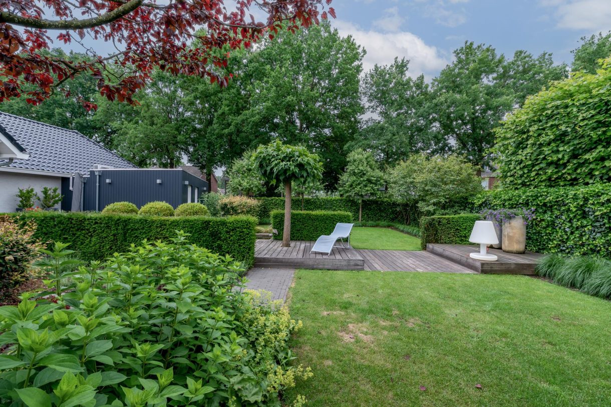 Tuin: Prachtig aangelegde tuin met terrassen, vijver geschikt voor Koi karpers en een zeer royale terrasoverkapping met buitenkeuken. De tuin biedt toegang aan de garage en de carport.