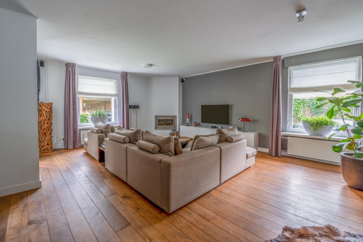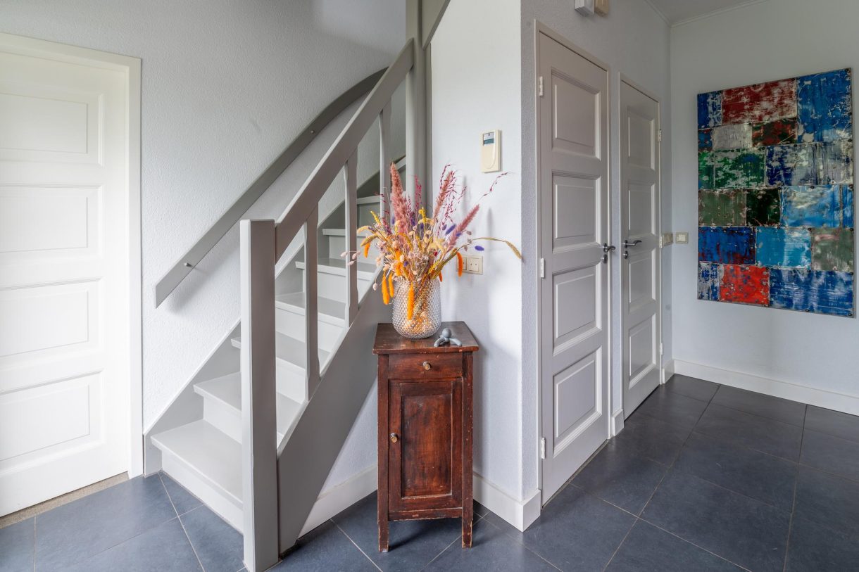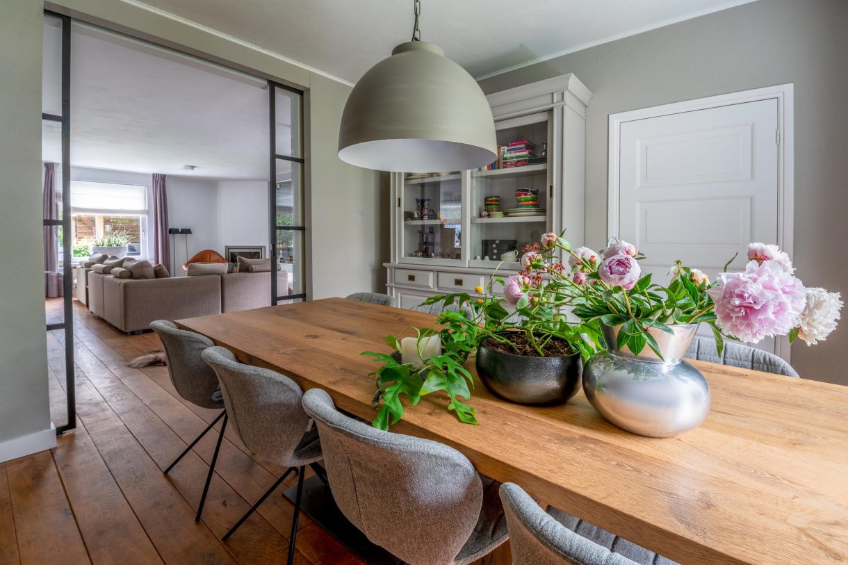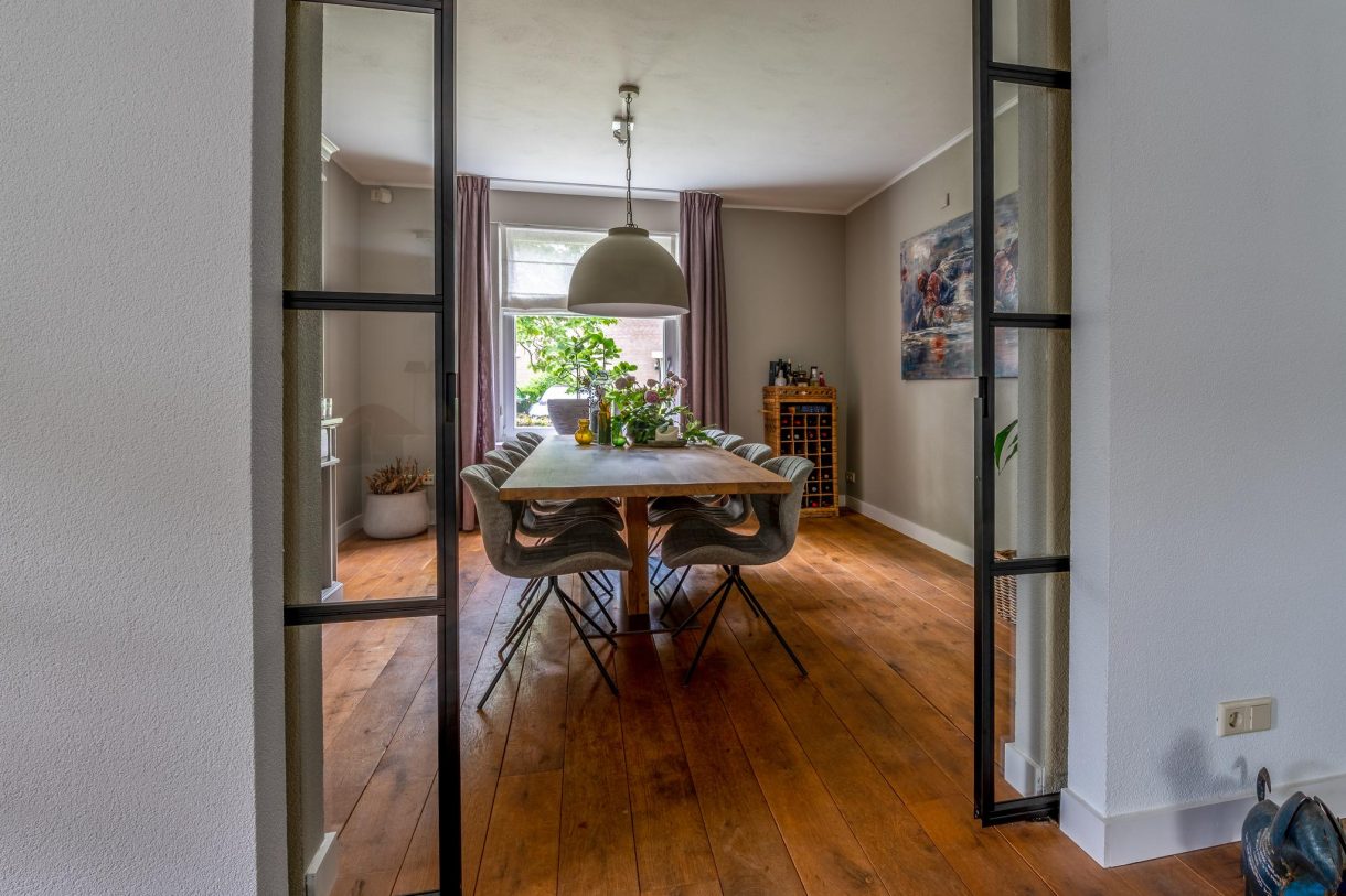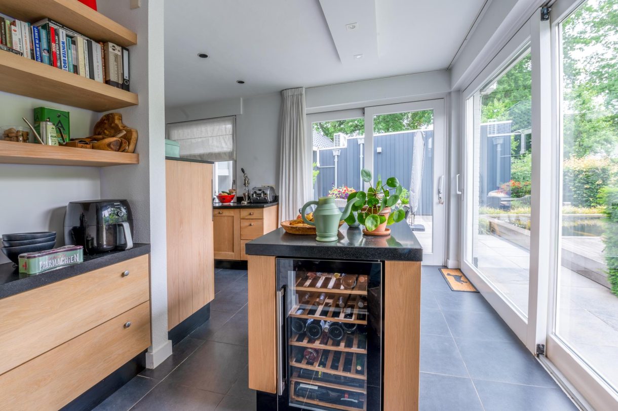 Entree, royale hal met trapopgang, toegang tot het kantoor en toiletruimte. De recent geplaatste zwart stalen deur biedt toegang aan de royale woonkamer met en suite naar de eetkamer. De ruimte naast de eetkamer is als sauna ingericht. De woonkamer biedt ook toegang aan de uitgebouwde keuken met een luxe eikenhouten keukeninrichting, voorzien van inbouwapparatuur waaronder een 6 pits Boretti fornuis en een Quooker. Via de keuken is de bijkeuken bereikbaar met de aansluitingen voor de wasapparatuur. Voorts is de woning voorzien van een royale en manshoge kelder van circa 12 m2.
