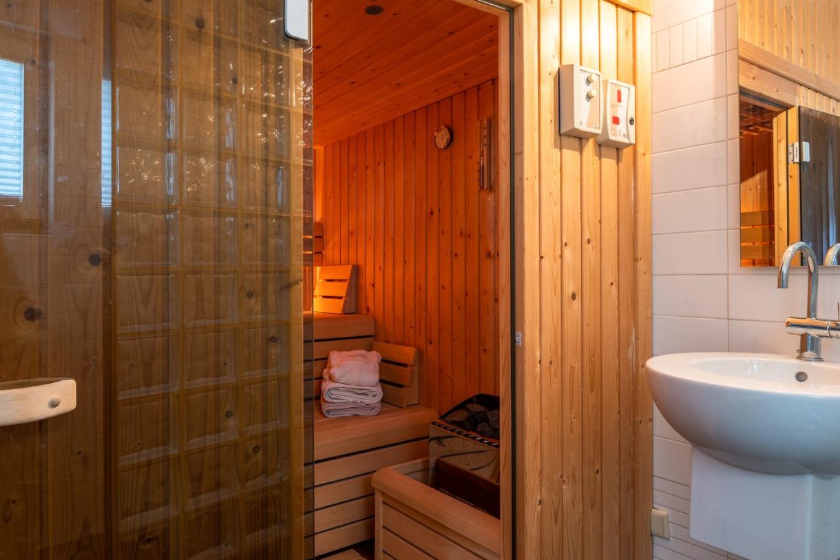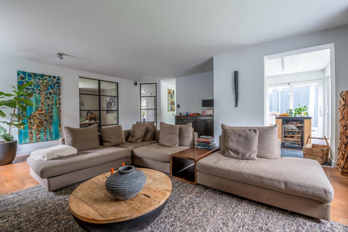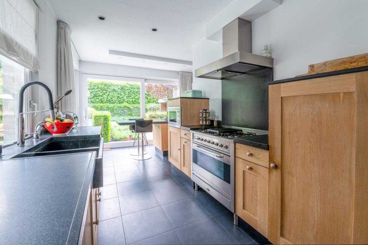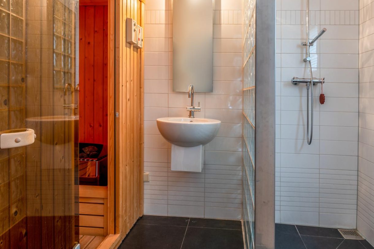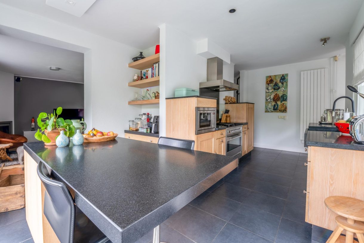 Entree, royale hal met trapopgang, toegang tot het kantoor en toiletruimte. De recent geplaatste zwart stalen deur biedt toegang aan de royale woonkamer met en suite naar de eetkamer. De ruimte naast de eetkamer is als sauna ingericht. De woonkamer biedt ook toegang aan de uitgebouwde keuken met een luxe eikenhouten keukeninrichting, voorzien van inbouwapparatuur waaronder een 6 pits Boretti fornuis en een Quooker. Via de keuken is de bijkeuken bereikbaar met de aansluitingen voor de wasapparatuur. Voorts is de woning voorzien van een royale en manshoge kelder van circa 12 m2.