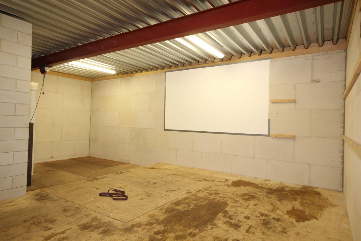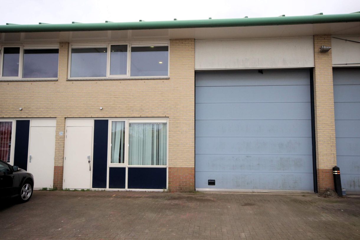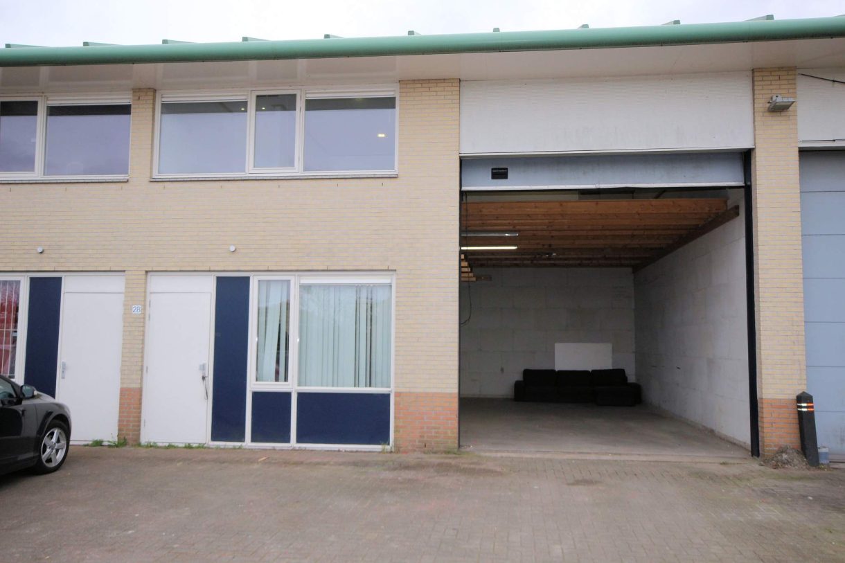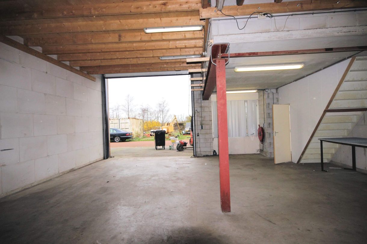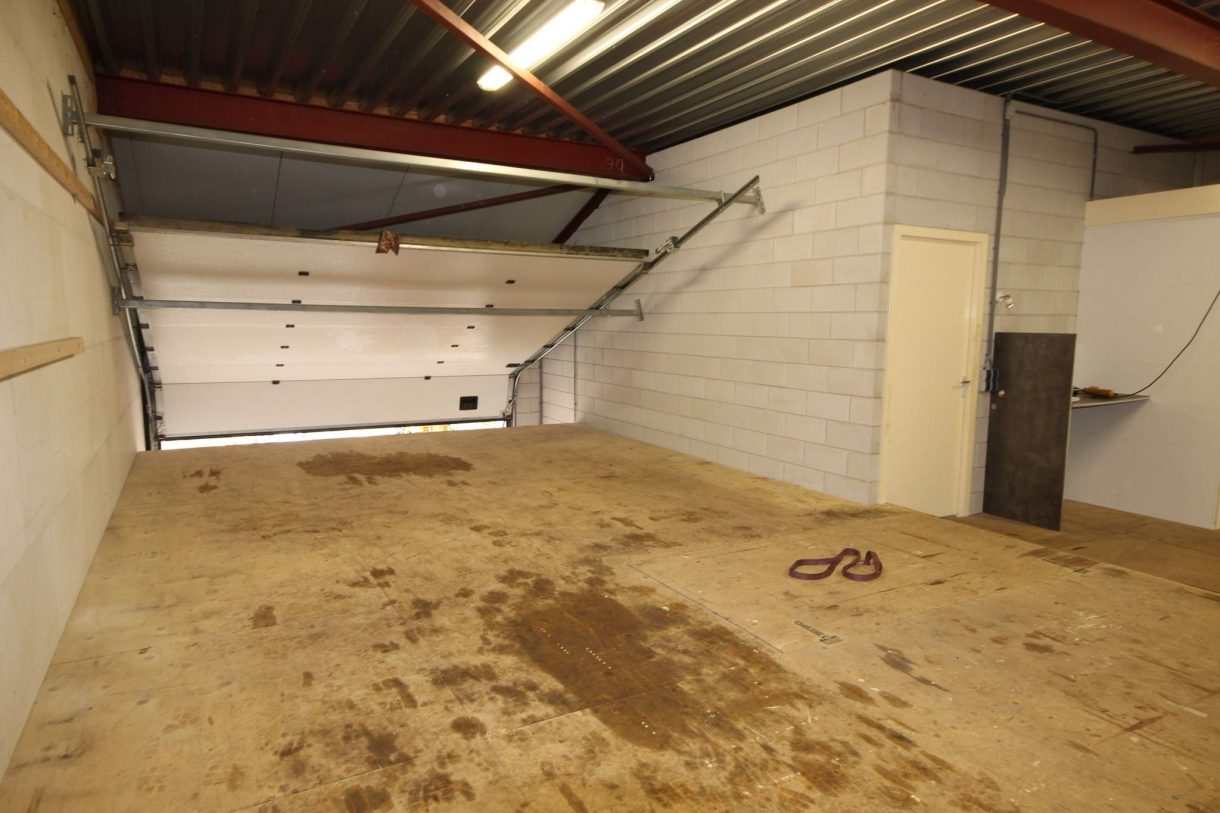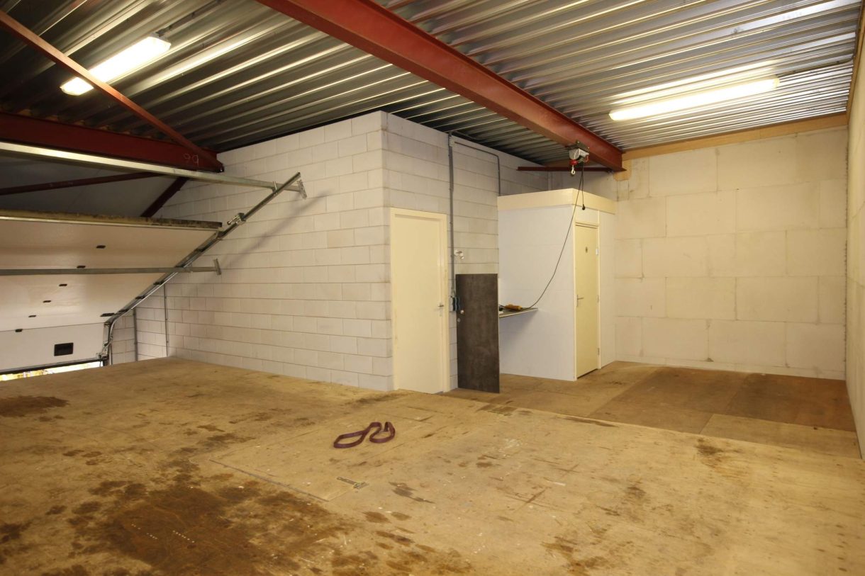 L- vormige bedrijfshal toegankelijk via overheaddeur en loopdeur met entree.