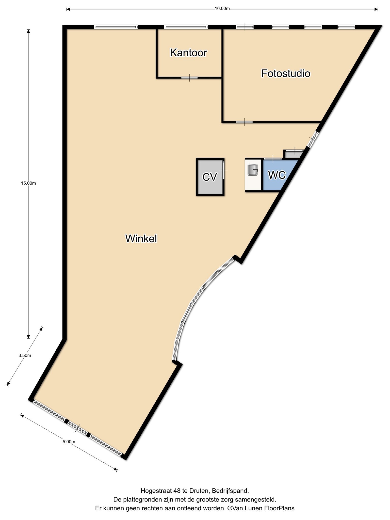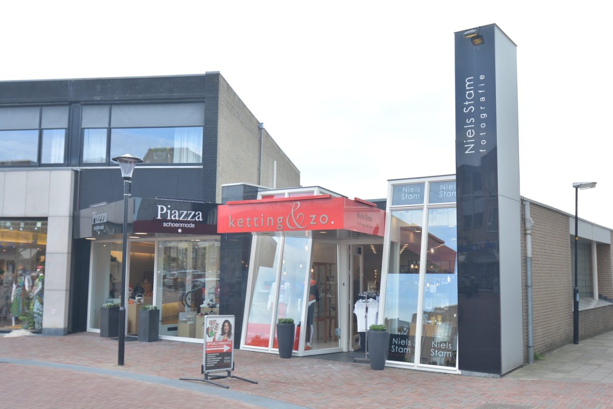 Winkelruimte met aangrenzend kantoortje, fotostudio, berging, pantry en toilet.