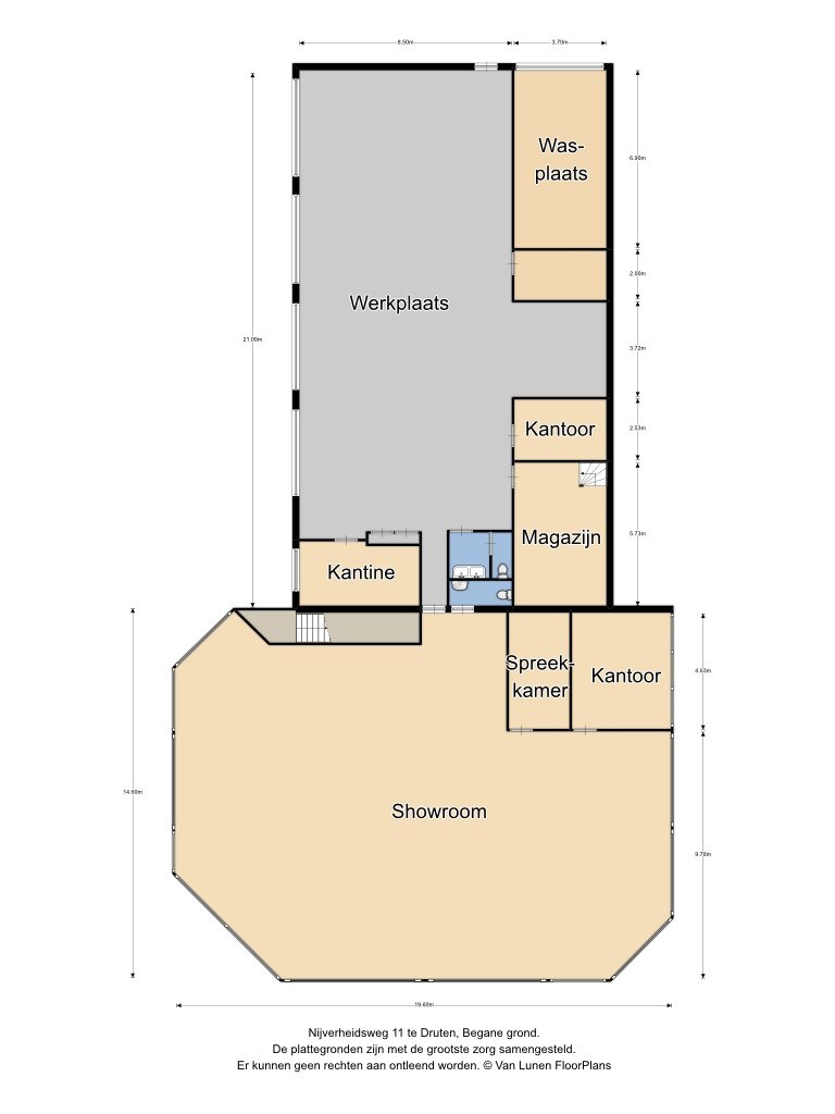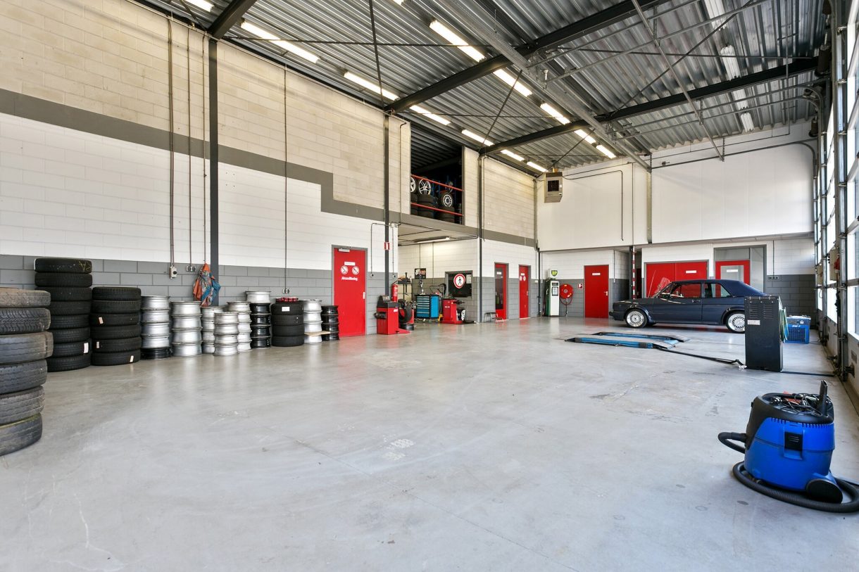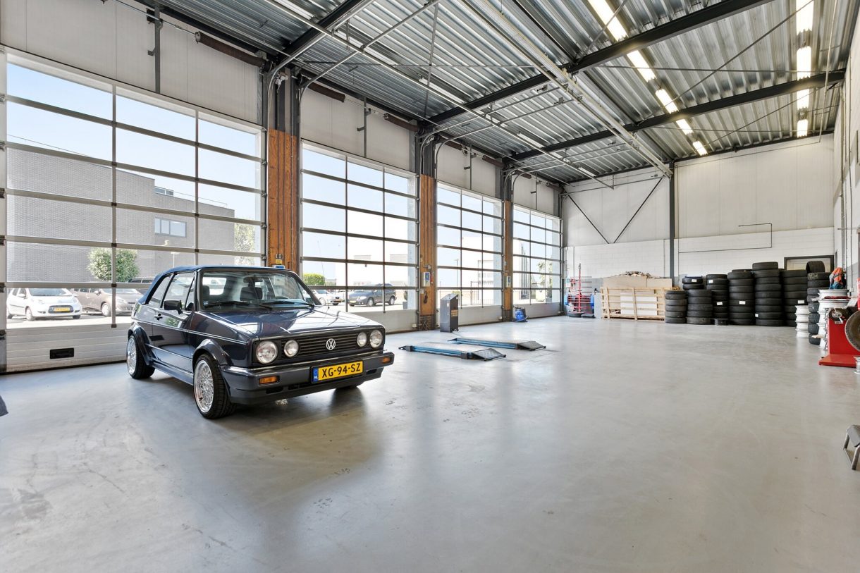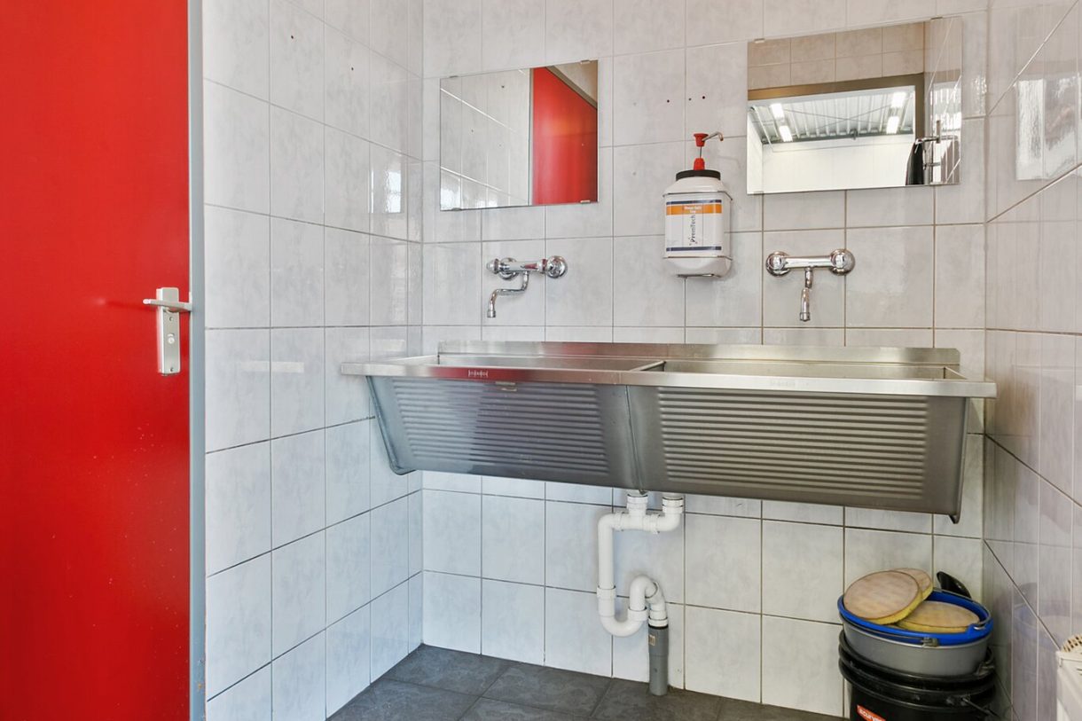 Werkplaats/productieruimte bestaande uit één grote ruimte met 4 overheaddeuren (doorrijhoogte 425 cm) met aangrenzend een kantine, magazijn opslag, kantoortje en wasplaats en op de verdieping archief en opslagruimte (vrije hoogte 550 cm).