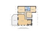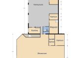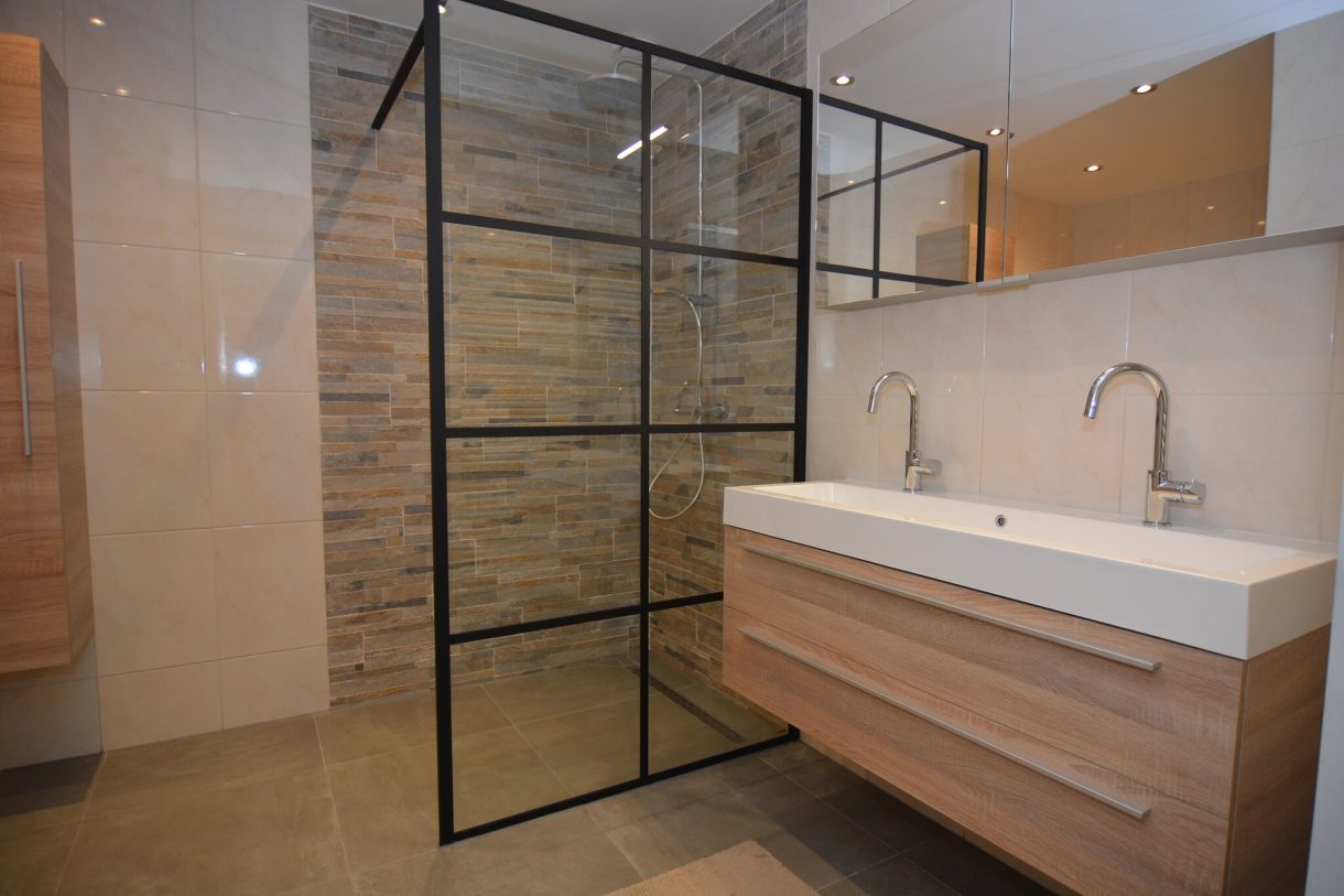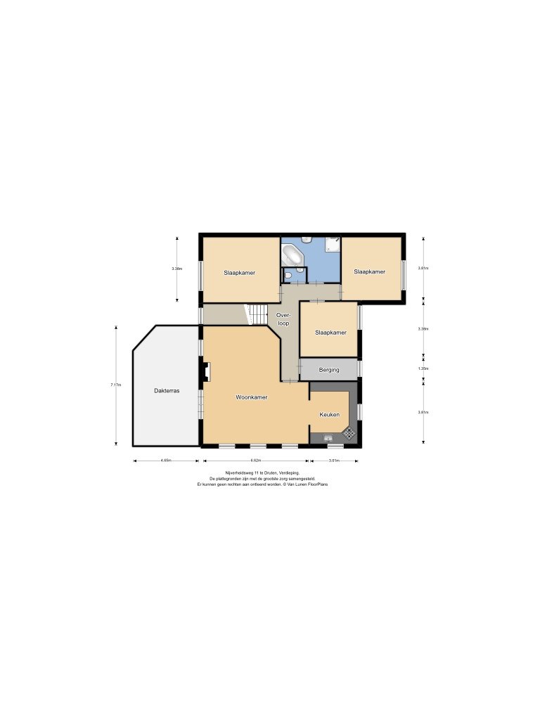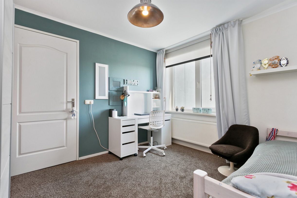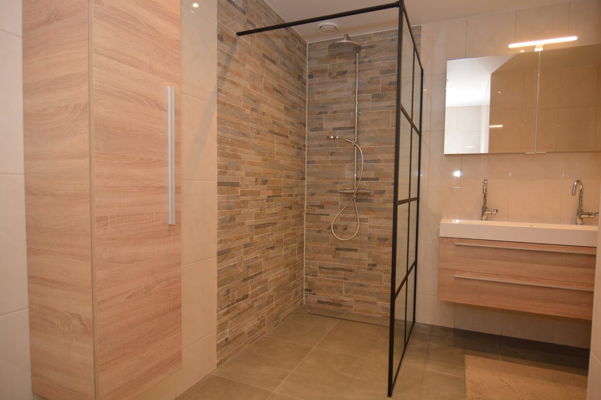 Woonhuis: veilig wonen op de eerste etage en alles gelijkvloers met een lichte woonkamer-keuken van 53 m² met gashaard in strakke schouw, L-vormig aanrecht met natuurstenen blad en inbouwapparatuur, tuindeuren naar dakterras, gang, 3 ruime slaapkamers van 16, 14 en 12 m², badkamer met bad en douche, bijkeuken.