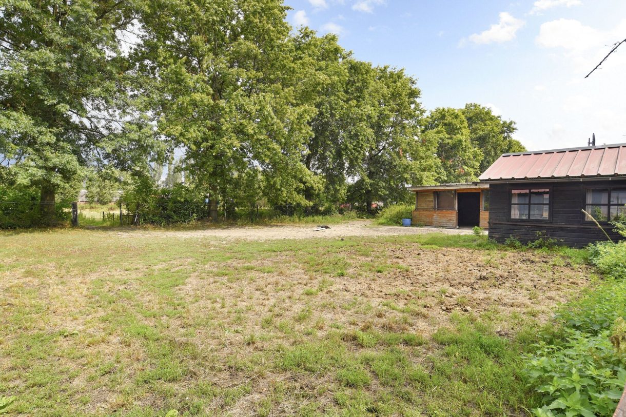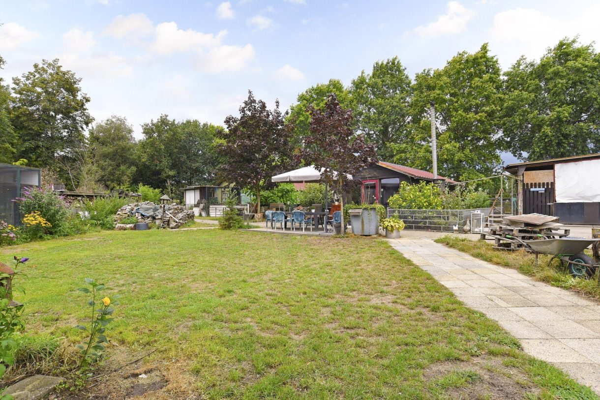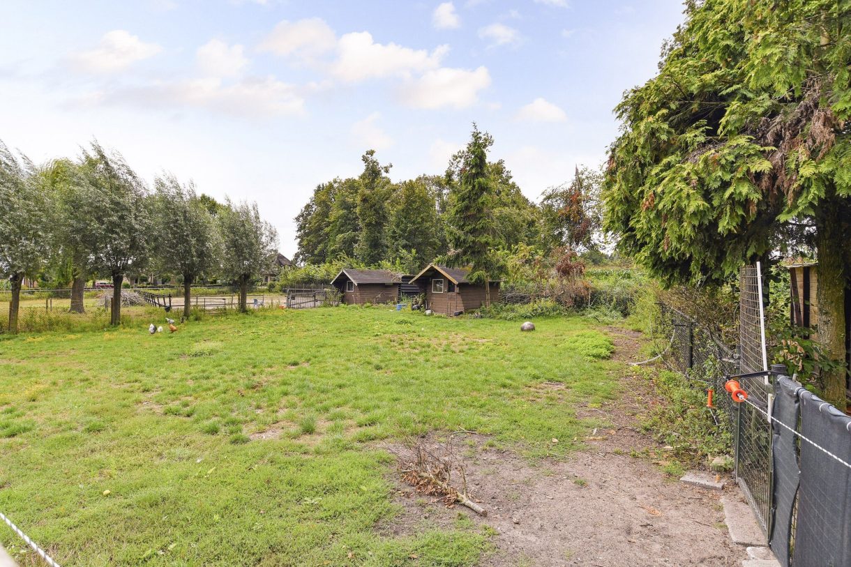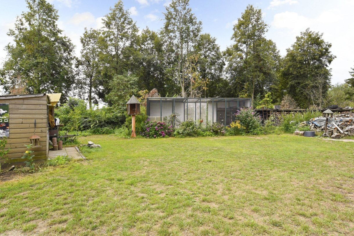 Naast de woning ligt een grote oprit naar de bedrijfsruimte. Links daarvan is een weiland met monumentale wilg. Het perceel aan de achterzijde is ingericht als tuin met daarop enkele opstallen. Er is een chalet geplaatst van ca. 38 m² met tegelvloer, houtkachel en keukenblok. Achter op het perceel staat een eenvoudige schuur/paardenstal opgetrokken met damwandplaten, totaal groot ca. 12 x 12 meter. Tot slot zijn er nog enkele kleine schuurtjes/bergingen.