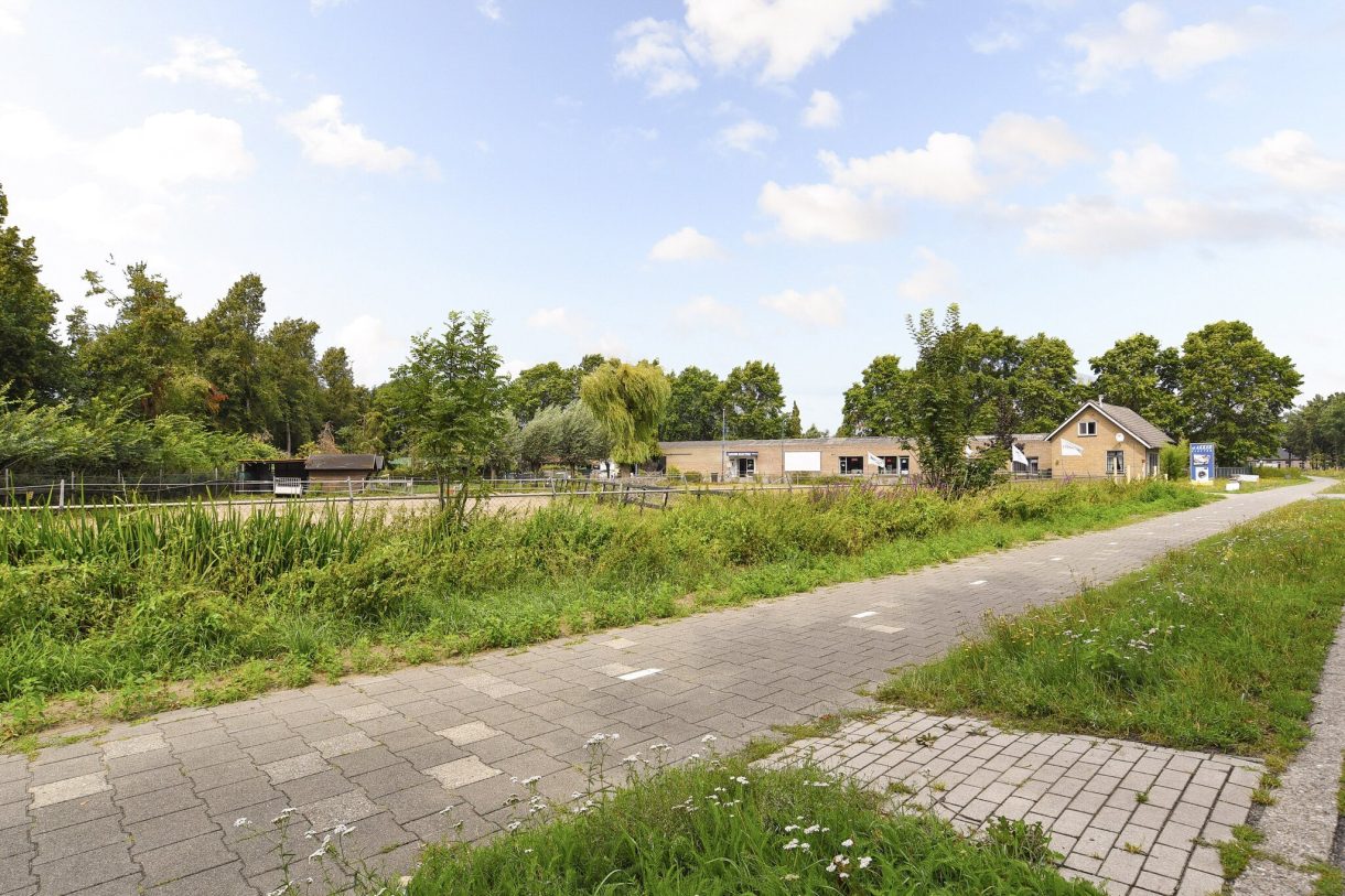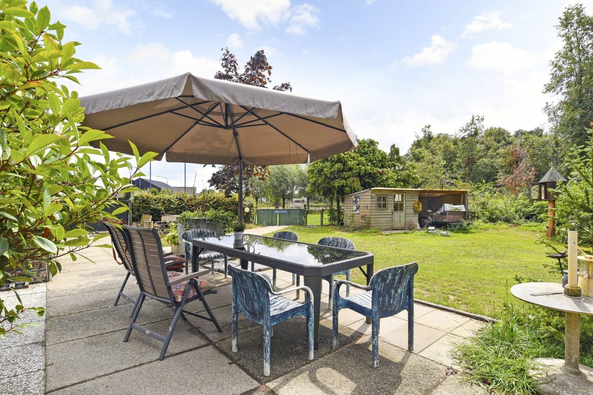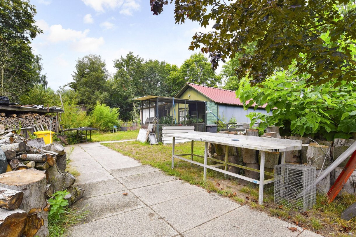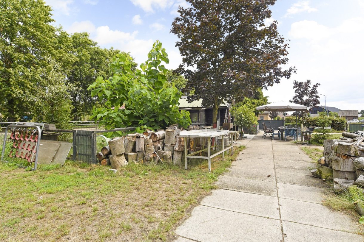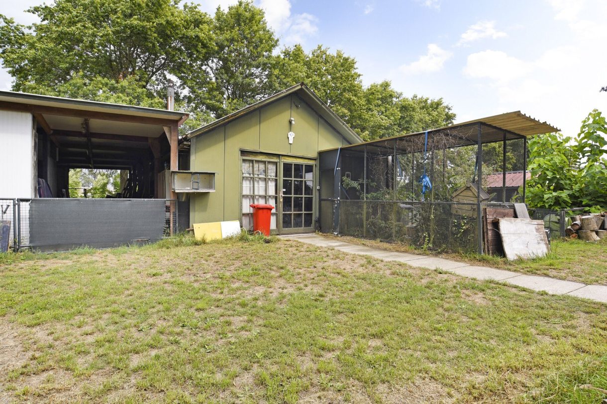 Naast de woning ligt een grote oprit naar de bedrijfsruimte. Links daarvan is een weiland met monumentale wilg. Het perceel aan de achterzijde is ingericht als tuin met daarop enkele opstallen. Er is een chalet geplaatst van ca. 38 m² met tegelvloer, houtkachel en keukenblok. Achter op het perceel staat een eenvoudige schuur/paardenstal opgetrokken met damwandplaten, totaal groot ca. 12 x 12 meter. Tot slot zijn er nog enkele kleine schuurtjes/bergingen.