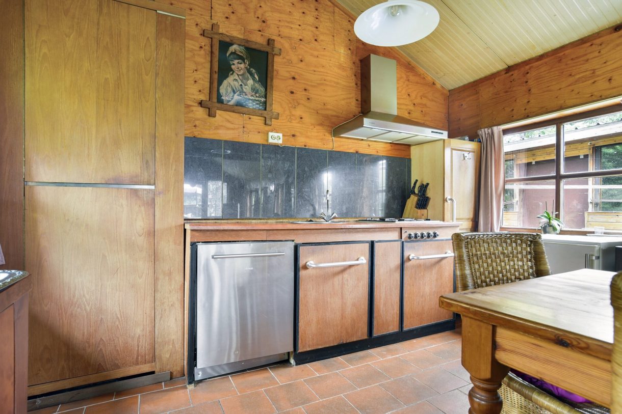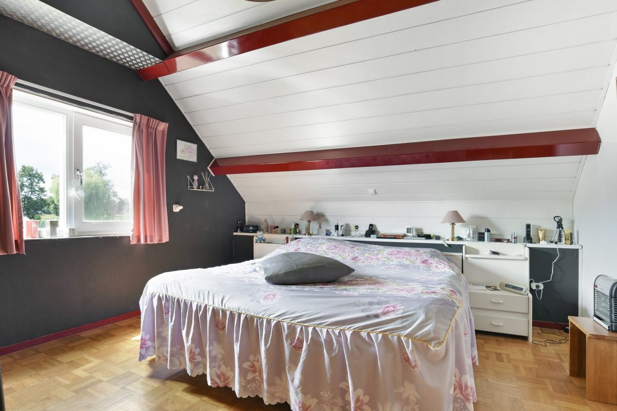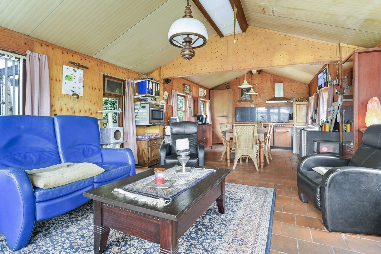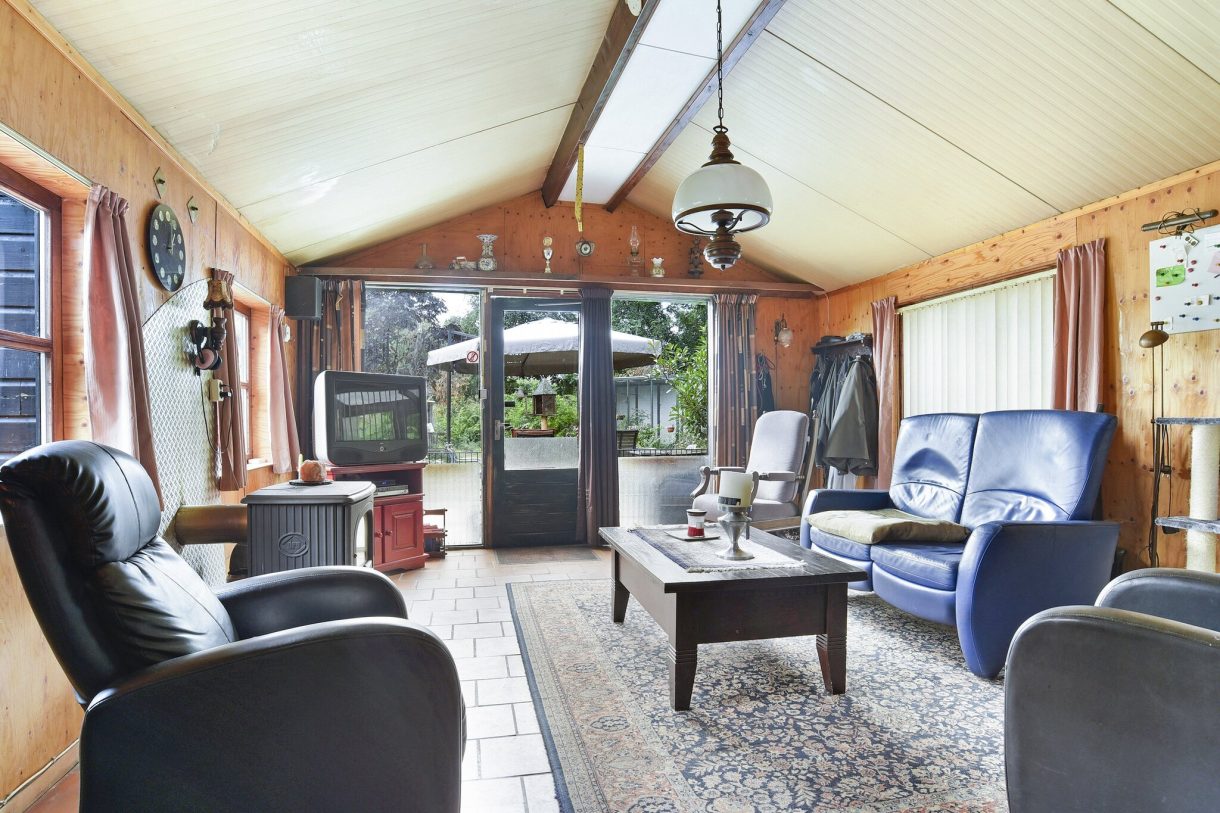 Naast de woning ligt een grote oprit naar de bedrijfsruimte. Links daarvan is een weiland met monumentale wilg. Het perceel aan de achterzijde is ingericht als tuin met daarop enkele opstallen. Er is een chalet geplaatst van ca. 38 m² met tegelvloer, houtkachel en keukenblok. Achter op het perceel staat een eenvoudige schuur/paardenstal opgetrokken met damwandplaten, totaal groot ca. 12 x 12 meter. Tot slot zijn er nog enkele kleine schuurtjes/bergingen.