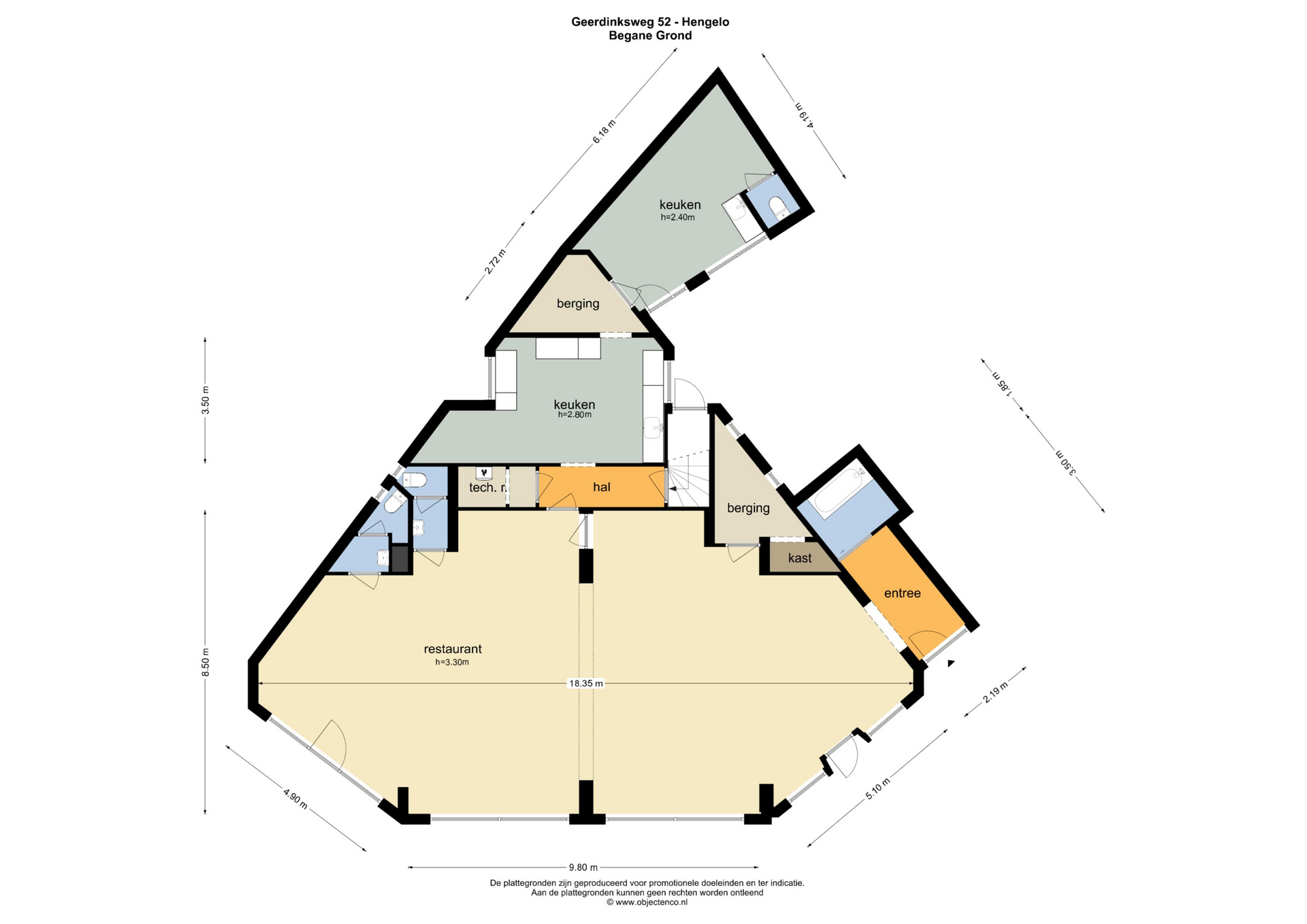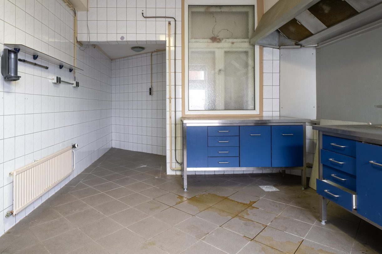 Entree aan de zijkant, restaurantgedeelte met berging en vaste kastruimte, een tweetal toiletgroepen, technische ruimte, tussenhal, keukenruimte met berging, achter portaal met keukenblok en toilet.