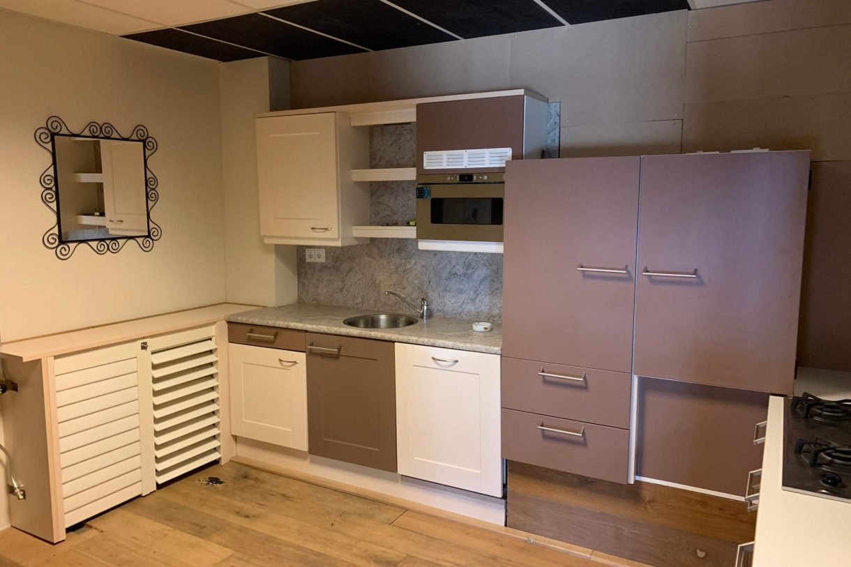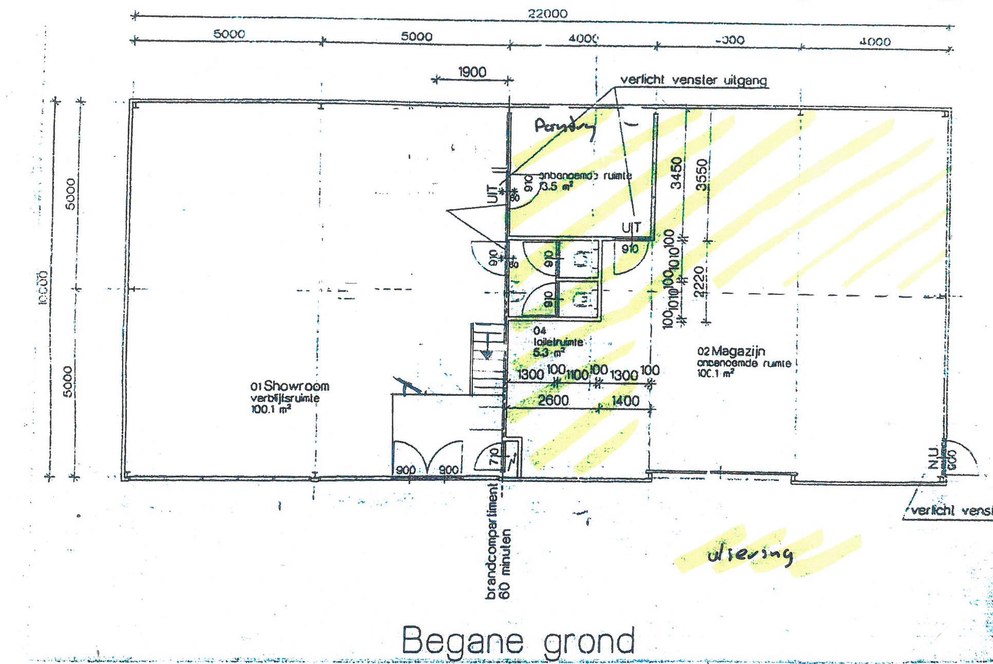 Entree, kantoor/showroom, toilet, pantry, bedrijfshal van 96 m2 met entresol van 64 m2. Vanuit de kantoor/showroom bereikt u via een vast trap de verdieping bestaande uit een open showroom ruimte met luxe keukenblok, een tweetal separate kantoorruimten en toegang tot het entresol.