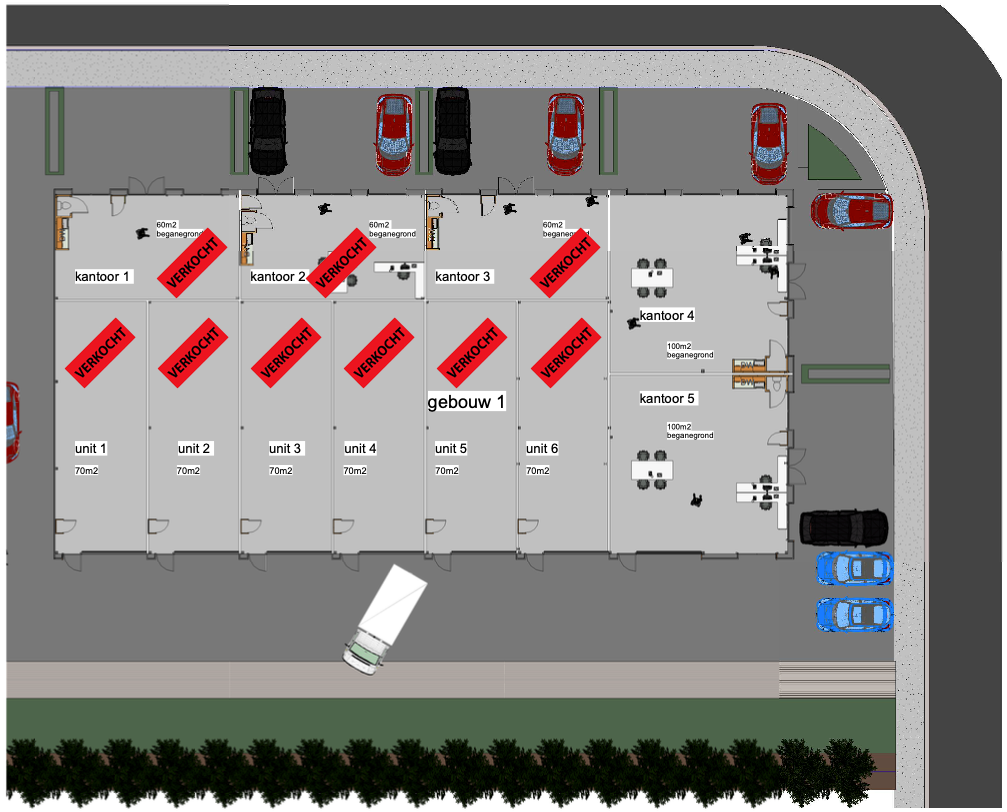 (kantoor 1 en 5 kunnen optioneel worden voorzien van een overhead deur)