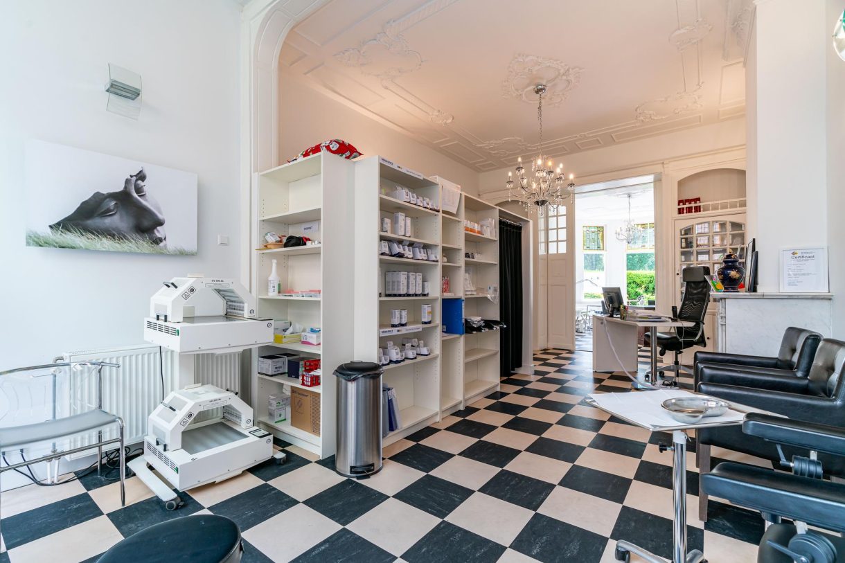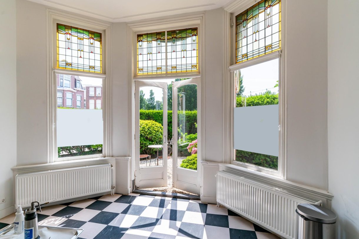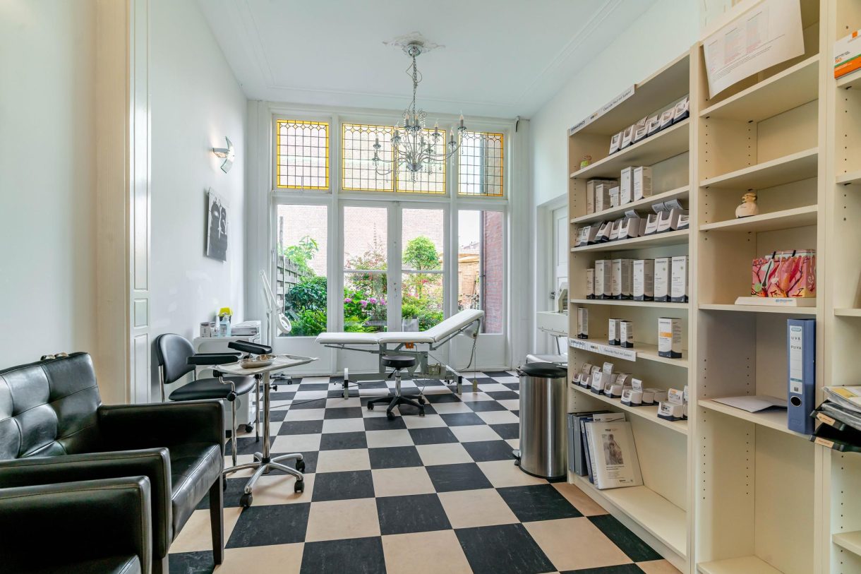 Riante voortuin waardoor het pand ver van de weg is gelegen, entree vanuit de Frankenslag met enorme hal die wordt gebruikt als ontvangstruimte en beschikt over een schitterende lichtinval, fraaie glas in lood bovenlichten, grote marmeren vloertegels, pantry, apart toilet met klapraam, wachtkamer en deur naar keurig aangelegde achtertuin van ca. 71 m² die beschikt over een zijingang en gunstig is gelegen op de ochtendzon.