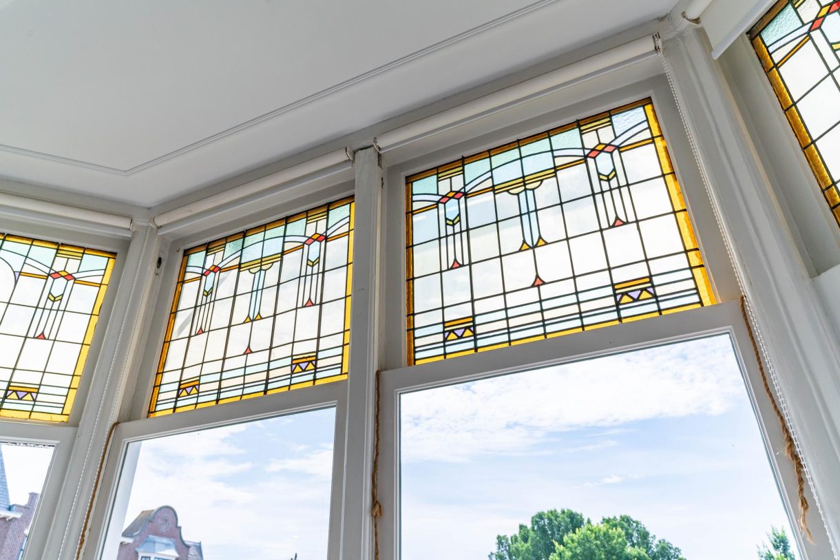 Vanuit de ontvangstruimte een brede trap naar de eerste etage, overloop met apart toilet en pantry, zijkamer aan de voorzijde met ramen aan tweede zijden dankzij ligging op de hoek. Hetzelfde geldt voor de zijkamer aan de achterzijde die tevens goed van formaat is. Vrij uniek voor Statenkwartier herenhuizen is dat de suiteseparatie op de eerste etage intact is gebleven en nog is voorzien van schuifdeuren en vaste kasten. Op deze etage wordt de vrije ligging van het pand benadrukt dat in combinatie met de grote raampartijen en de hoge ornamenten plafonds resulteert in een zeer aangename sfeer.