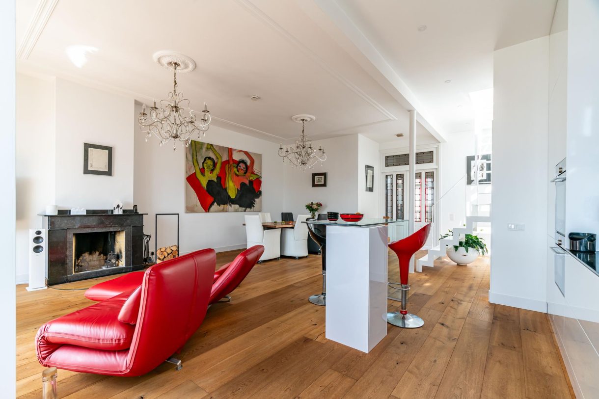 Middels een afgesloten deur is de woonetage op de tweede verdieping te bereiken met een klassiek trappenhuis en een doorgebroken woonkamer aan de zuidwestkant van dit indrukwekkende herenhuis. De woonkamer is tot aan de nok van de toren doorgebroken waarbij de originele balken een mooi contrast vormen met het strakke stucwerk. De luxe open keuken is voorzien van composiet werkblad, hoog model Siemens bakoven, inbouw stoomoven, vaatwasser, Quooker en wijnklimaatkast. Daarnaast beschikt deze woonkamer over een open haard, fraaie houten vloeren en een charmant voorbalkon met vrij uitzicht over het Statenkwartier. Tussengelegen overloop en woonkamer beschikken over vloerverwarming per CV-ketel.