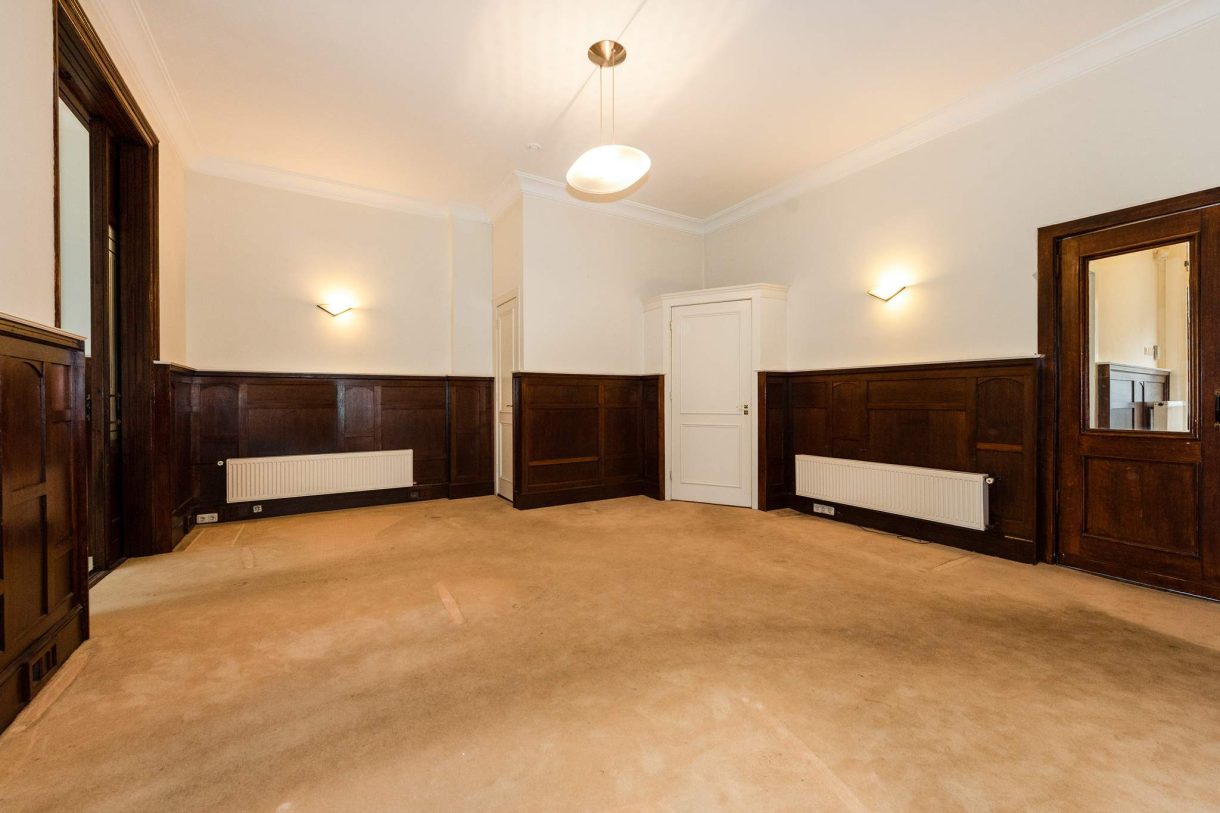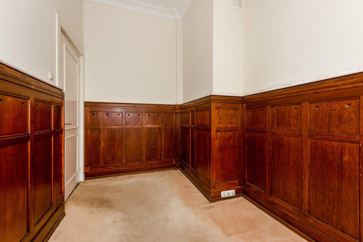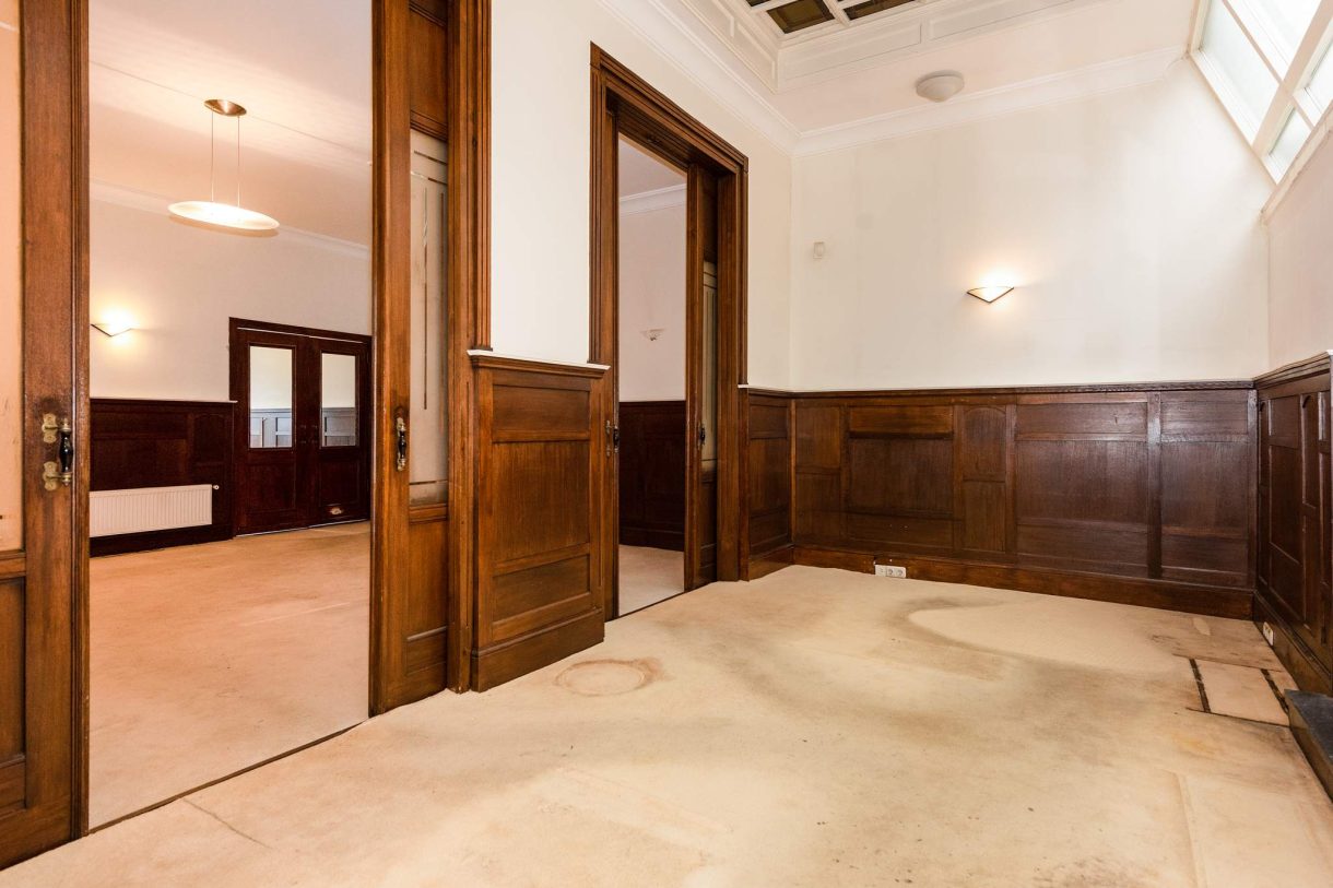Entree ruime vestibule ca. 3.39×1.85 met originele houten lambriseringen en fraaie granito vloer, voorkamer ca. 3.90×2.40 eveneens met houten lambriseringen, glas in lood bovenlicht en meterkast, grote centrale kantoorruimte ca. 6.37×5.36 met een prachtige hoogte van 3.40 meter, houten lambriseringen rondom, toegang tot modern toilet met voorportaal, plavuizen vloer, facet geslepen tegelwerk en wandcloset, toegang tot pantry met rvs aanrecht, koelkast en onderkast.