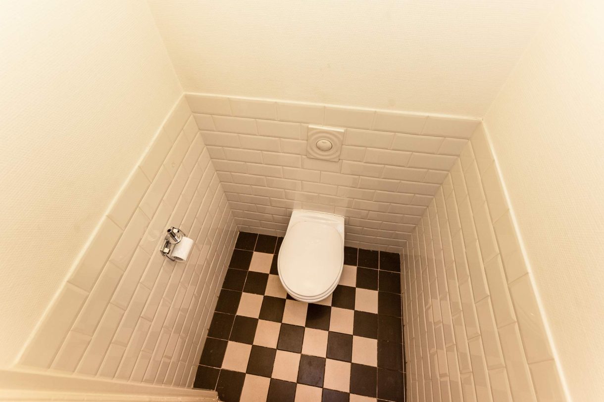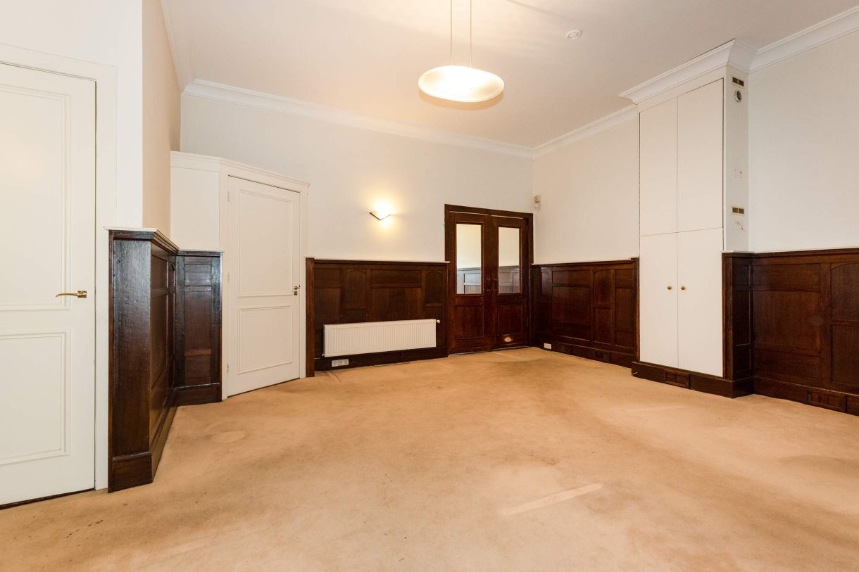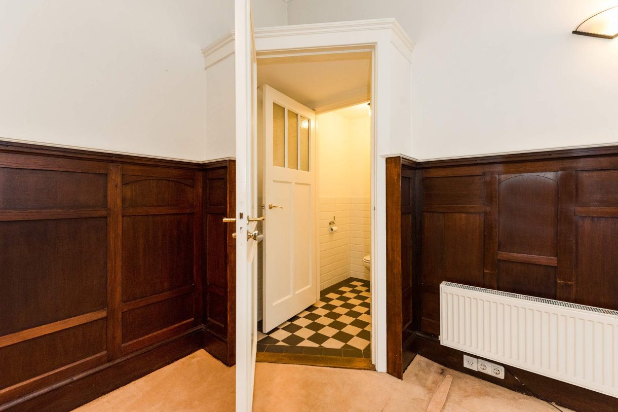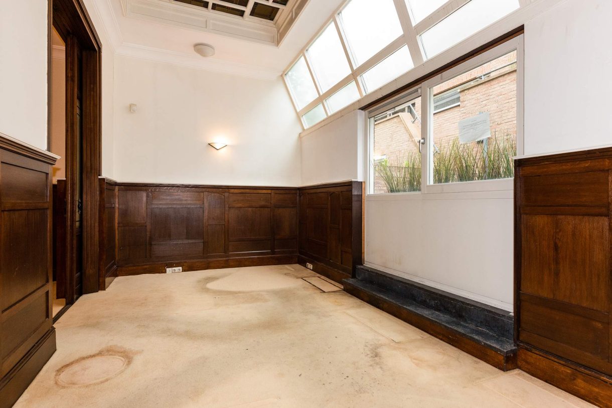 Entree ruime vestibule ca. 3.39×1.85 met originele houten lambriseringen en fraaie granito vloer, voorkamer ca. 3.90×2.40 eveneens met houten lambriseringen, glas in lood bovenlicht en meterkast, grote centrale kantoorruimte ca. 6.37×5.36 met een prachtige hoogte van 3.40 meter, houten lambriseringen rondom, toegang tot modern toilet met voorportaal, plavuizen vloer, facet geslepen tegelwerk en wandcloset, toegang tot pantry met rvs aanrecht, koelkast en onderkast.