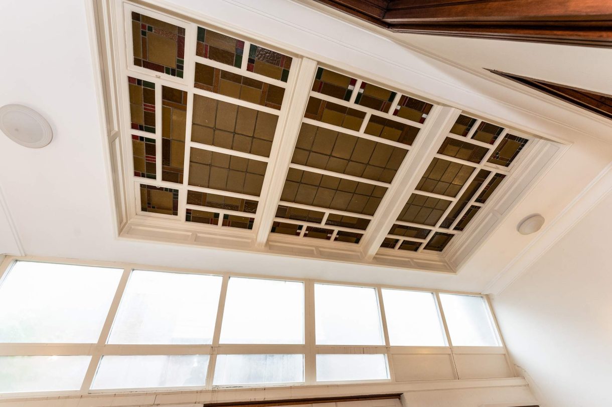 Voorts tweemaal schuifdeuren met geslepen glas naar ruime lichte serre ca. 6.06×3.08 met glas in lood paneel in het plafond,