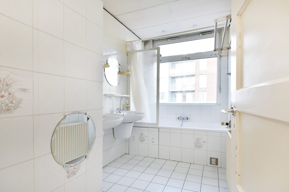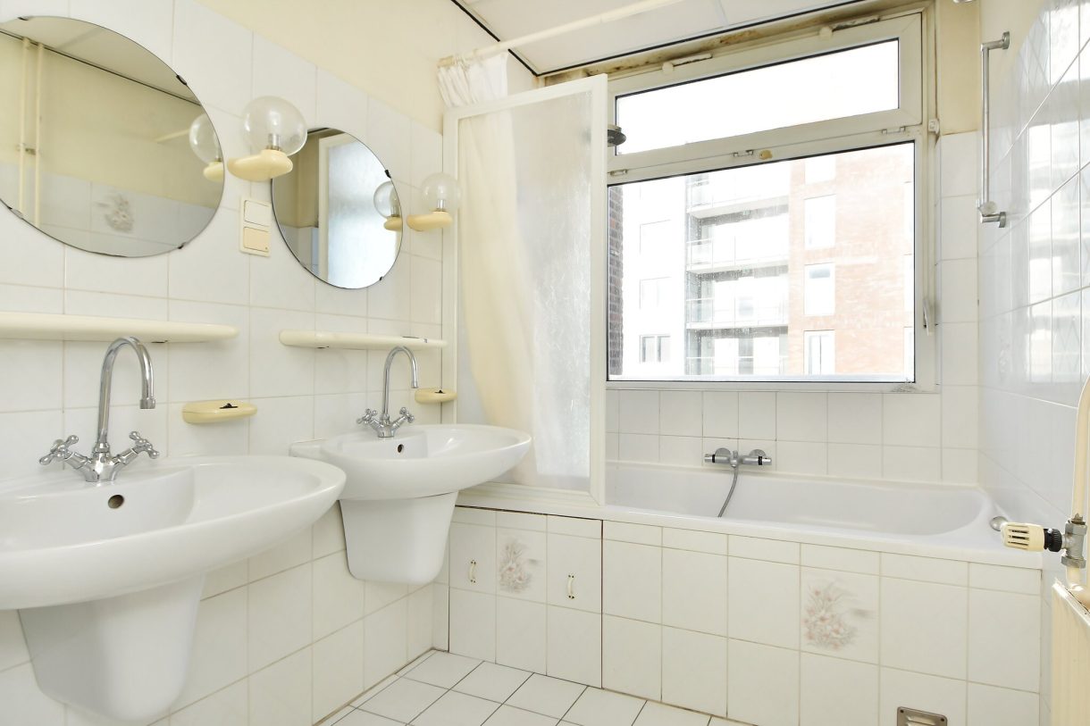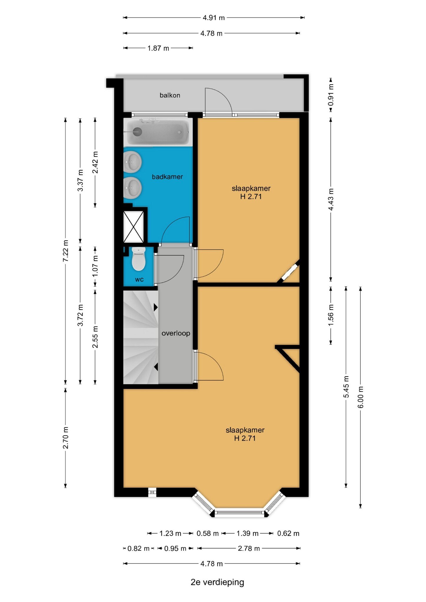 Trap naar 2e etage, overloop met toilet, badkamer ca. 3.37×1.87 met ligbad met douchewand, dubbele vaste wastafel en te openen bovenlicht ten behoeve van ventilatie, achterkamer ca. 4.43×2.78 met marmeren schouw en deur naar achterbalkon over de volle breedte, L-vormige voorkamer ca. 4.78/2.78×5.45 met erker.