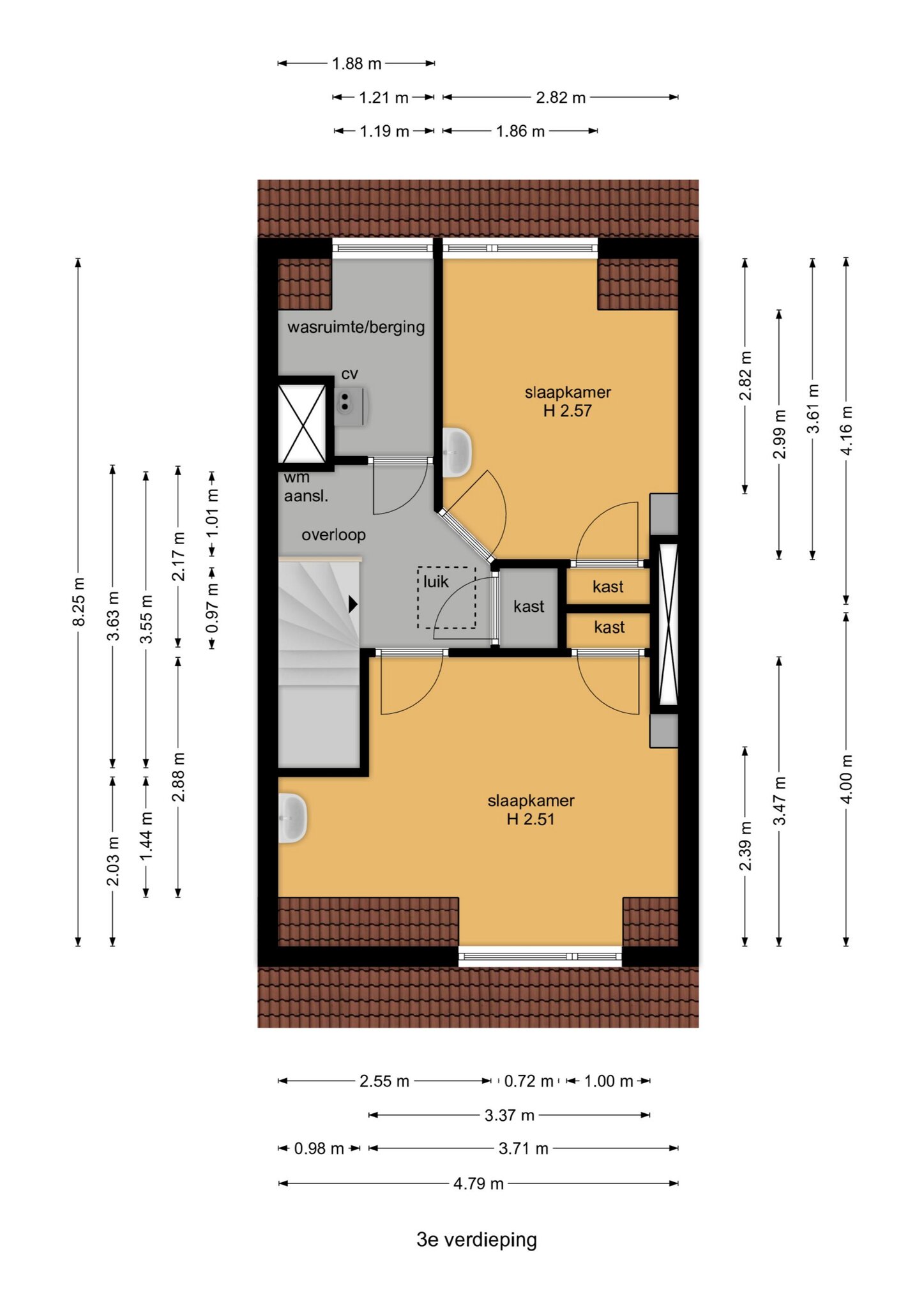 Trap naar kapverdieping, overloop met vast kast, opstelplaats wasmachine en luik naar vliering, achterzijkamer ca. 2.82×1.88 met dakkapel en CV-combiketel Vaillant, achterkamer ca. 3.61×2.82 met dakkapel, vaste kast, vaste wastafel en berging in de knieschotten, voorkamer over de volle breedte ca. 4.79/3.47×2.88 met dakkapel, vaste kast, vaste wastafel en berging in de knieschotten.