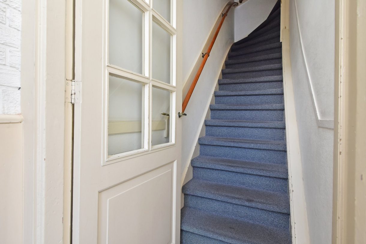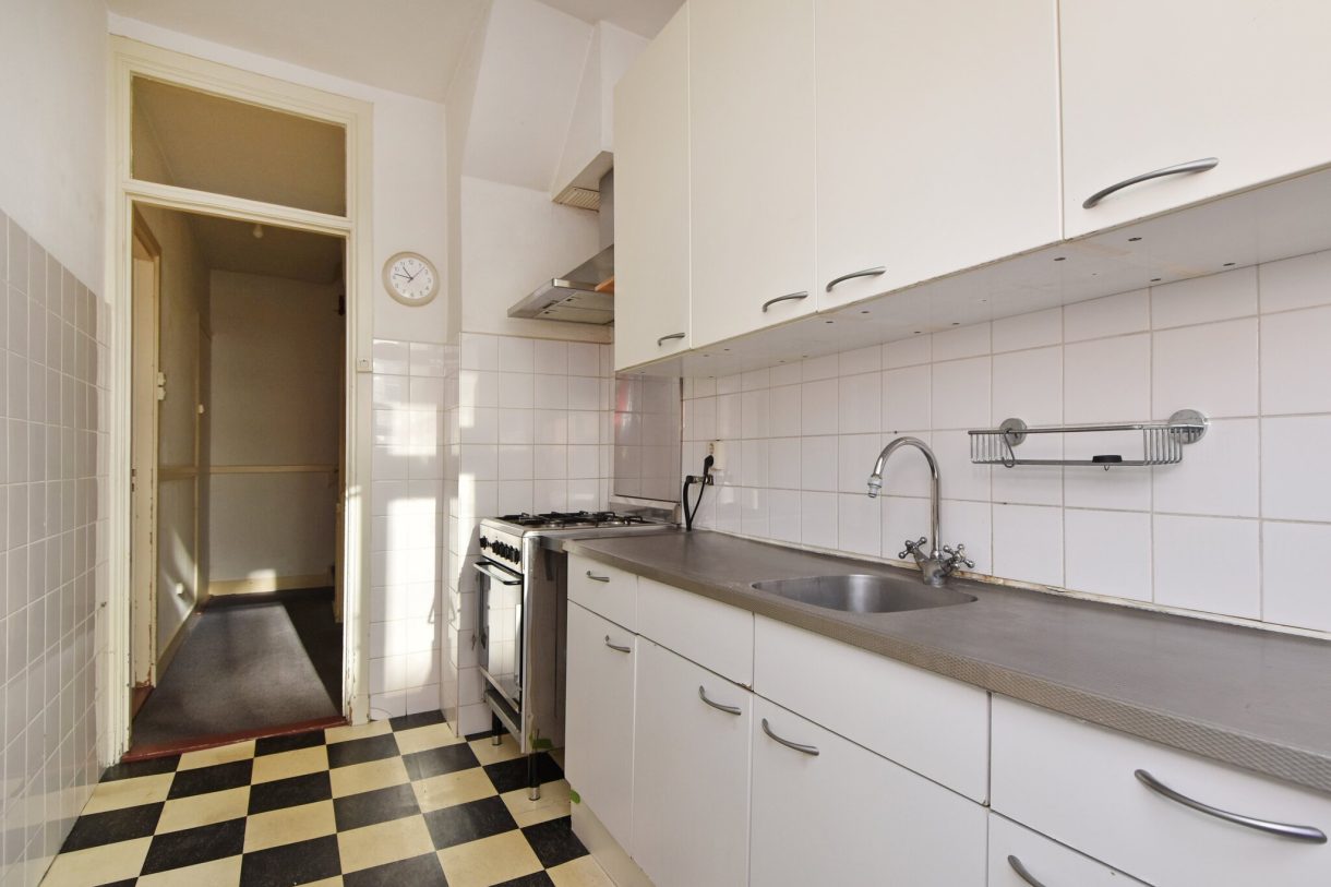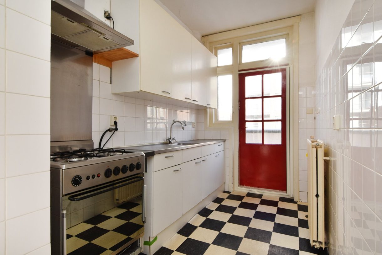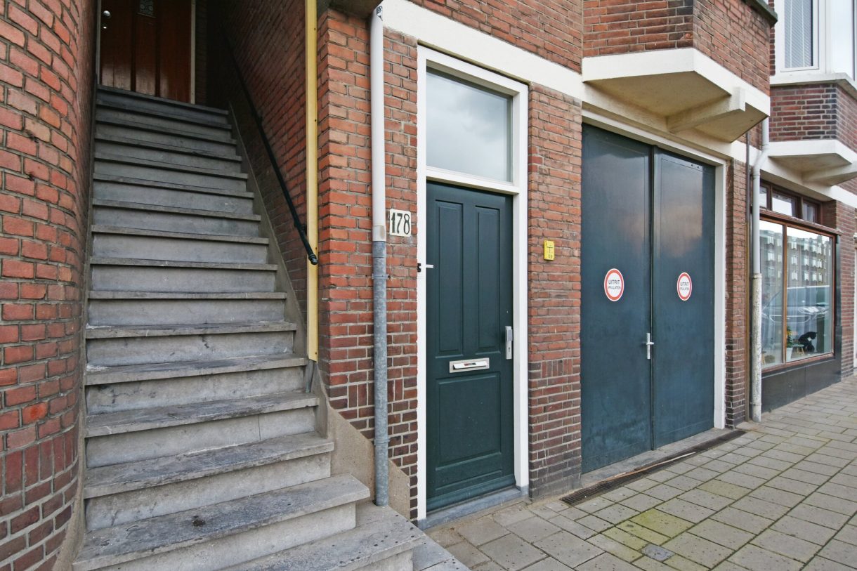 Nummer 178; entree begane grond, vestibule met meterkast met elektra- en watermeter, tochtdeur voor trapopgang met kast met gasmeter. Trap naar 1e etage, overloop met toilet, keuken ca. 3.30×1.77 met rvs aanrecht, fornuis met afzuigkap en terrasdeur, kamers en suite ca. 10.50×2.76 deels 4.78 met originele suiteseparatie met 4 vaste kasten en schuifdeuren met glas-in-lood, 2 marmeren schouwen, originele plafonds, erker aan de voorzijde en openslaande deuren aan de achterzijde naar ruim terras ca. 4.88×2.87 op de middagzon met balkonkast.