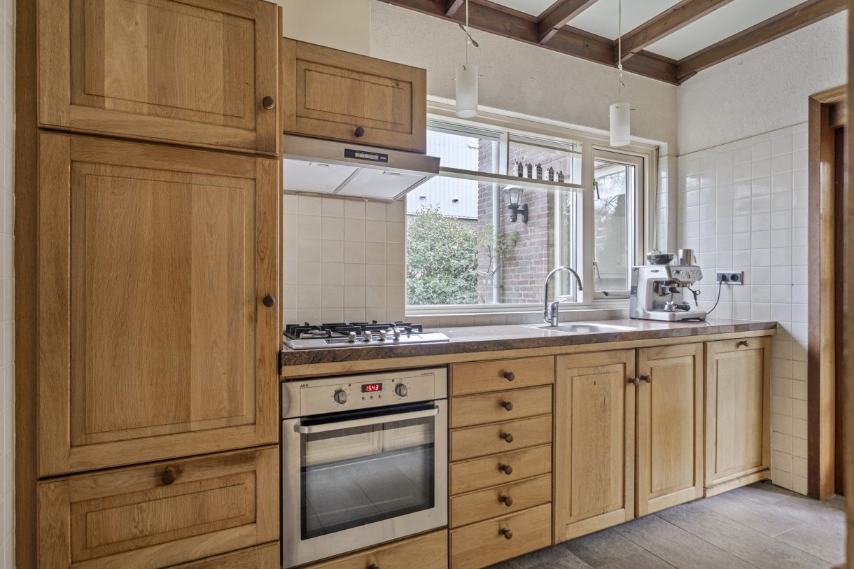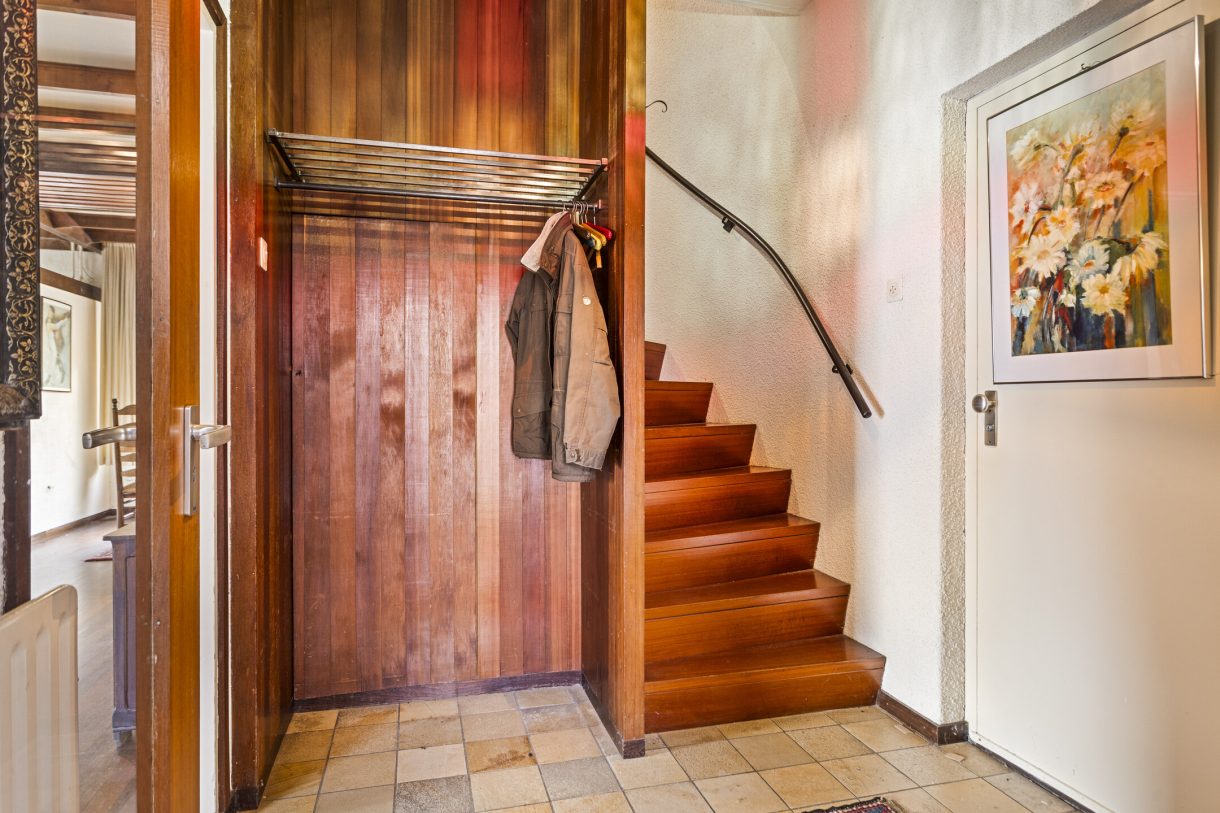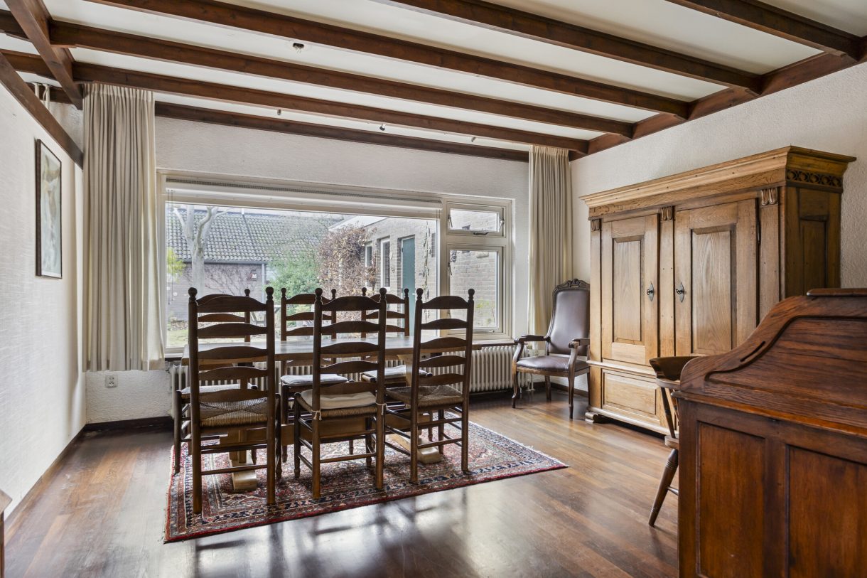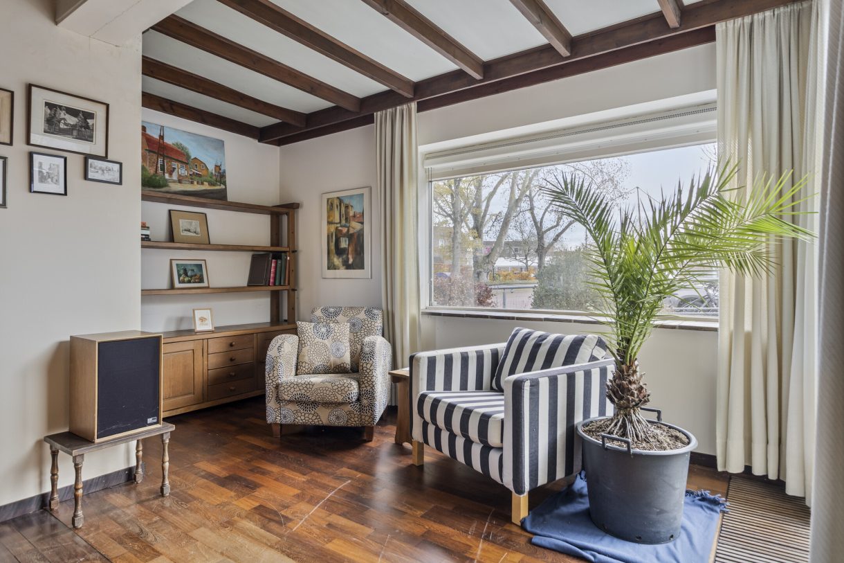 De overdekte entree ligt aan de voorzijde van de woning. Hier is een hal met toiletruimte, meterkast en trapopgang naar de verdieping. Vanuit de hal is toegang tot de leefruimte en de kantoorruimte. De woonkamer is ruim van opzet en heeft een speelse vorm, waarbij een heerlijk zitgedeelte en eetgedeelte is ontstaan. Aan het zitgedeelte is nog een mooi zit-/leeshoekje met ramen op de zonzijde en tuin aan de zijkant. Op de vloer in de woonkamer ligt een parketvloer en er is een schoorsteen met houthaard. Ideaal voor het inbouwen van een moderne houtkachel. De halfopen keuken heeft een houten inrichting met granietenblad en inbouwapparatuur zoals koelkast, gaskookplaat en oven. Via de keuken is ook toegang tot de serre/tuinkamer. Deze ruimte heeft rondom ramen gericht op de tuin en is eveneens voorzien van een schouw met houthaard, zeker geschikt voor een houtkachel. Een heerlijk plekje om te vertoeven.