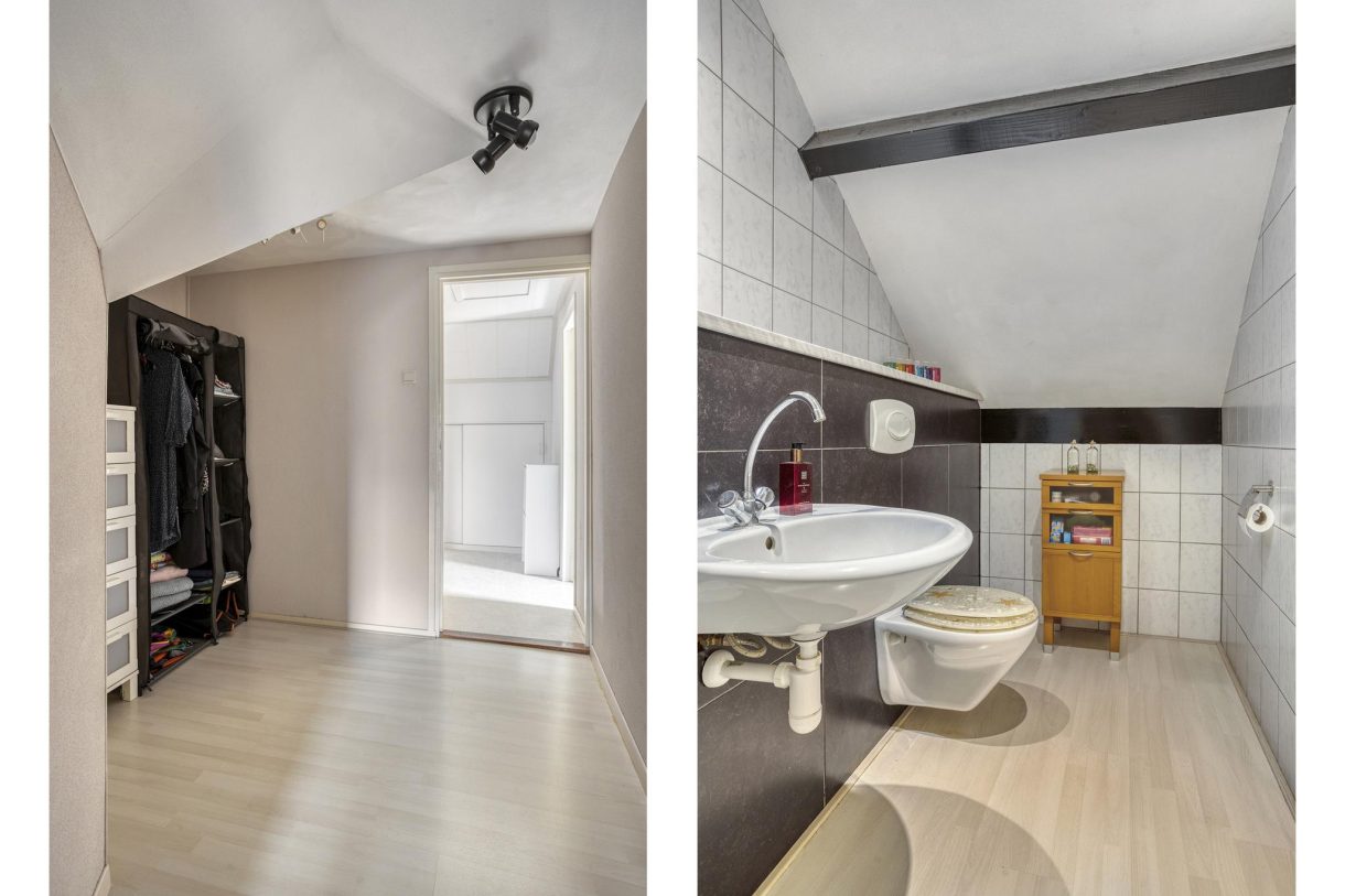 In de achterbouw van de woning is een grote bijkeuken met witgoedaansluitingen en een buitendeur. Vanuit deze bijkeuken is ook de toiletruimte, badkamer en slaapkamer op de begane grond toegankelijk. Deze slaapkamer op de begane grond is ruim 14 m² groot en heeft openslaande deuren naar de tuin en naar de overkapping aan de zijkant. Naast slaapkamer kan deze kamer ook prima dienst doen als kantoor/praktijkruimte aan huis dan wel een tuin-/speel- of werkkamer. De keurige badkamer is voorzien van een ligbad, inloopdouche en wastafel met meubel.