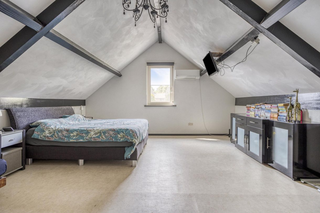 Op de 1e verdieping is een royale overloop met toegang tot 2 slaapkamers aan weerzijde van de woning en nog 1 grote slaapkamer boven de achterbouw. Tussenin zit een doorloop met bergruimte en een toiletruimte met wastafel. Op de slaapkamers is airco aanwezig. Een luik geeft toegang tot een vliering voor extra bergruimte.