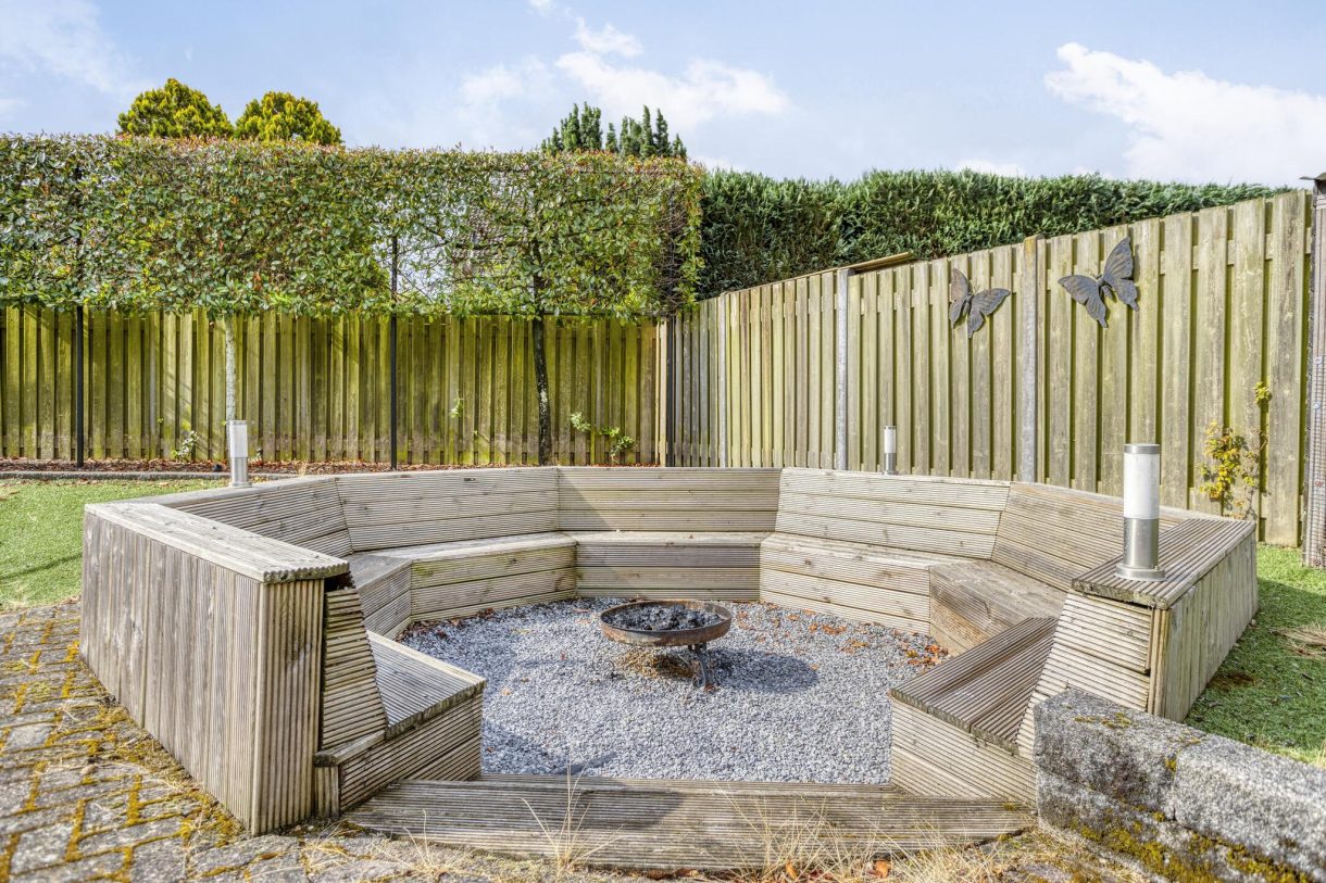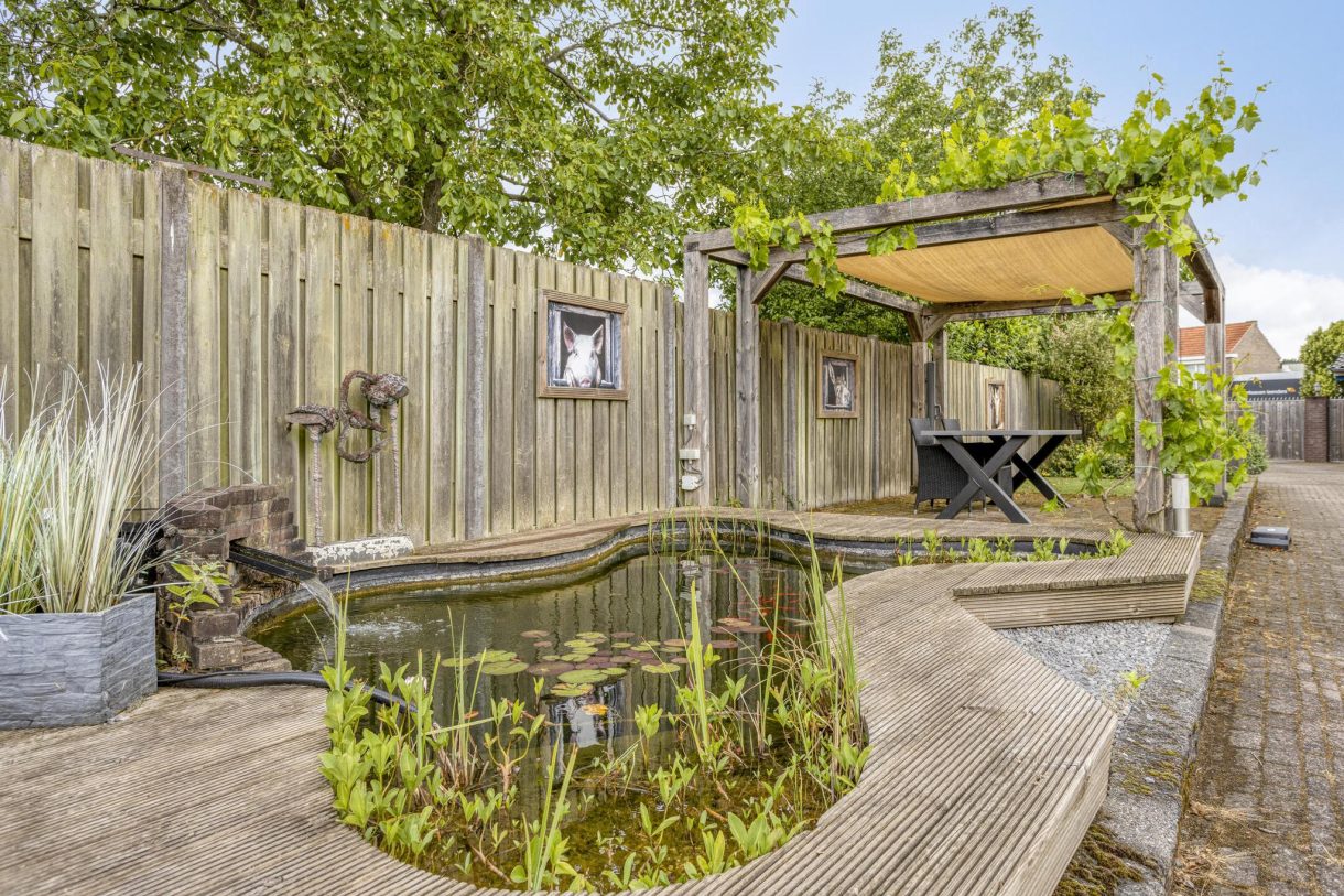 De tuin is grotendeels verhard met betonklinkers en verder voorzien van een gedeelte met kunstgras, een vijver, verhoogd terras met houten vlonderplanken en een zitkuil. Door de aanwezige verharding en de grote dubbele poort aan de voorzijde van de woning is het bijgebouw ook makkelijk bereikbaar.