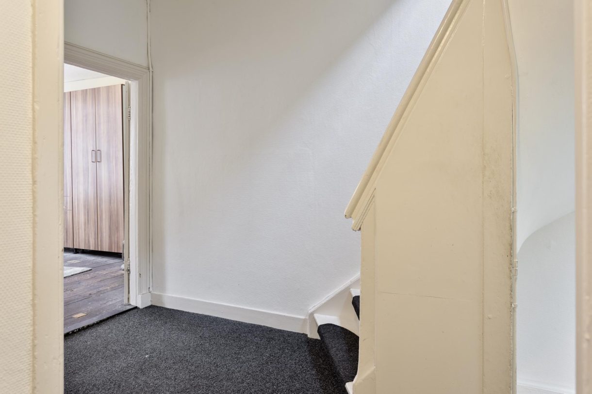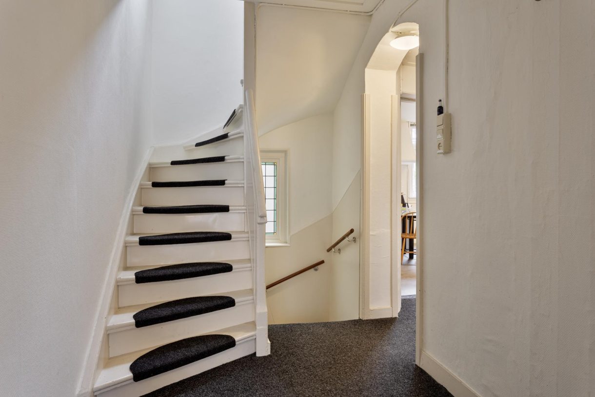 De bordestrap gaat verder naar de tweede verdieping, waar drie (voormalige slaap-)kamers wachten op een nieuwe invulling. Dubbele deuren in de kamer aan de achterzijde geven toegang tot het platte dak.