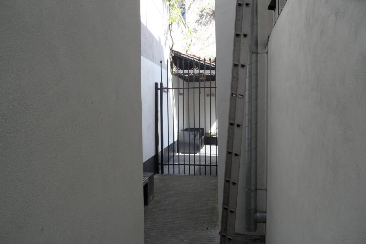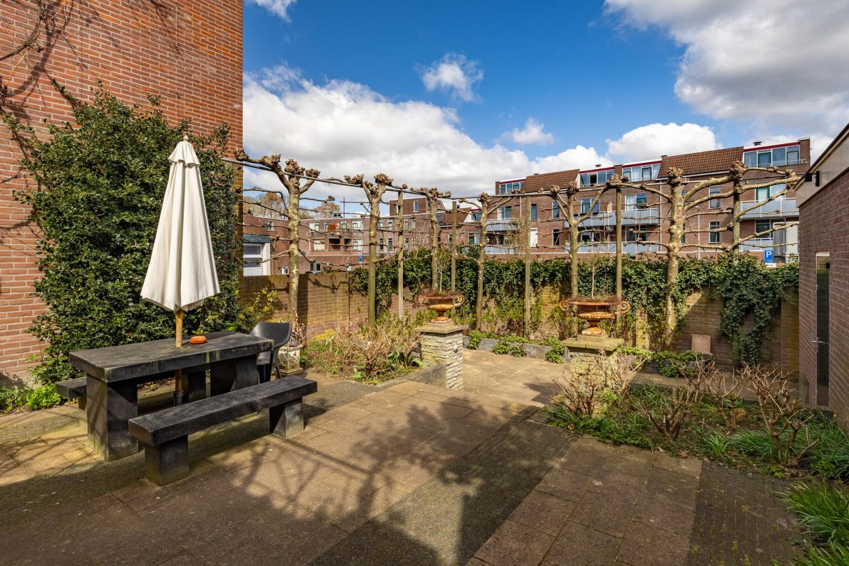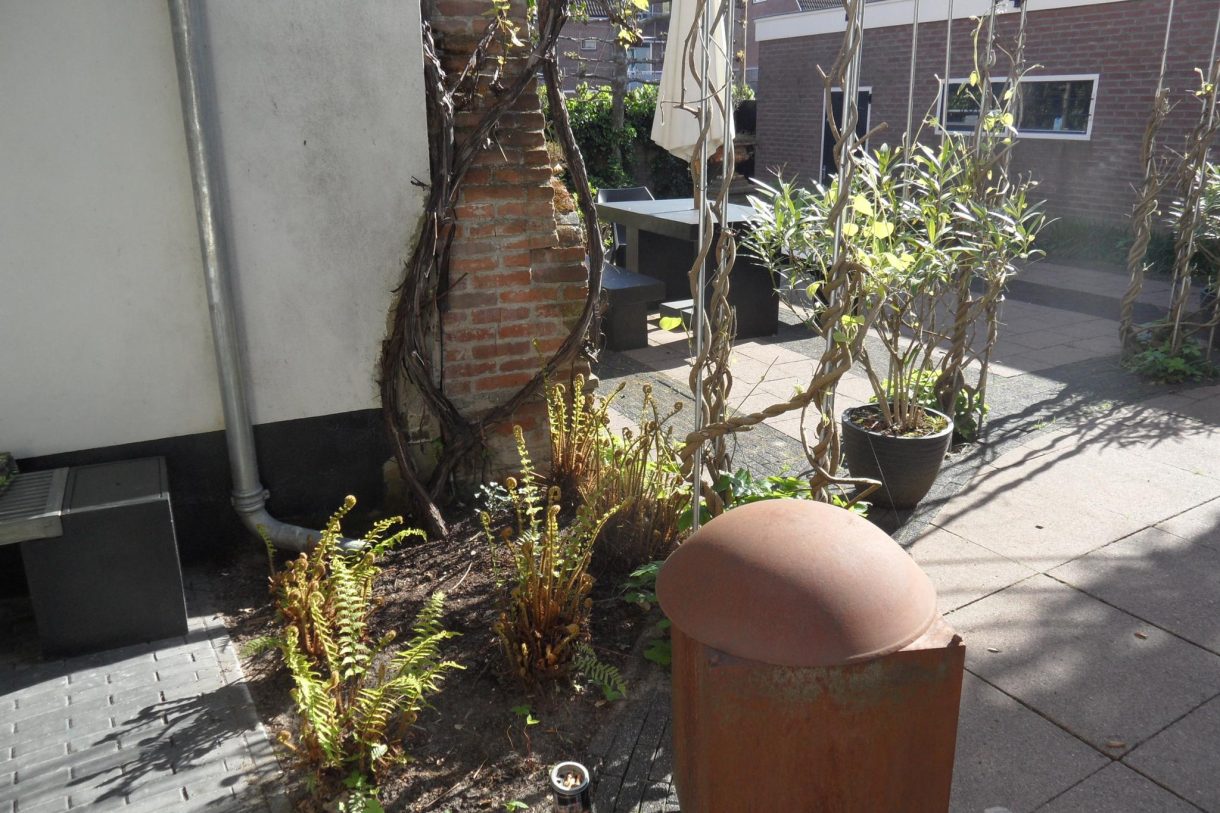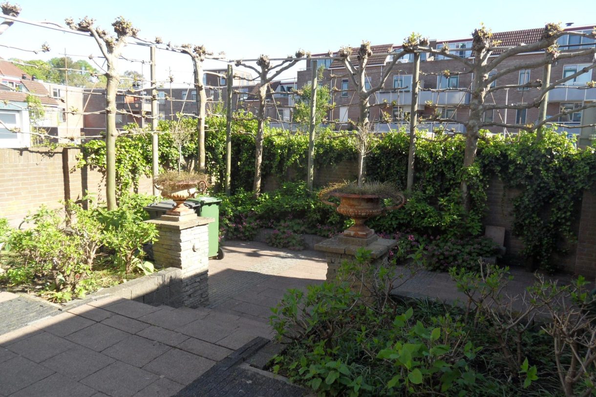 Openslaande deuren geven toegang tot de diepe tuin, die bij mooi weer ook als kapsalon wordt gebruikt. De tuin is fraai aangelegd met sierbestrating en gevarieerde beplanting, waaronder groenblijvende klimop en leibomen aan twee zijden. Er is een achterom naar de achtergelegen Hamersplaats.