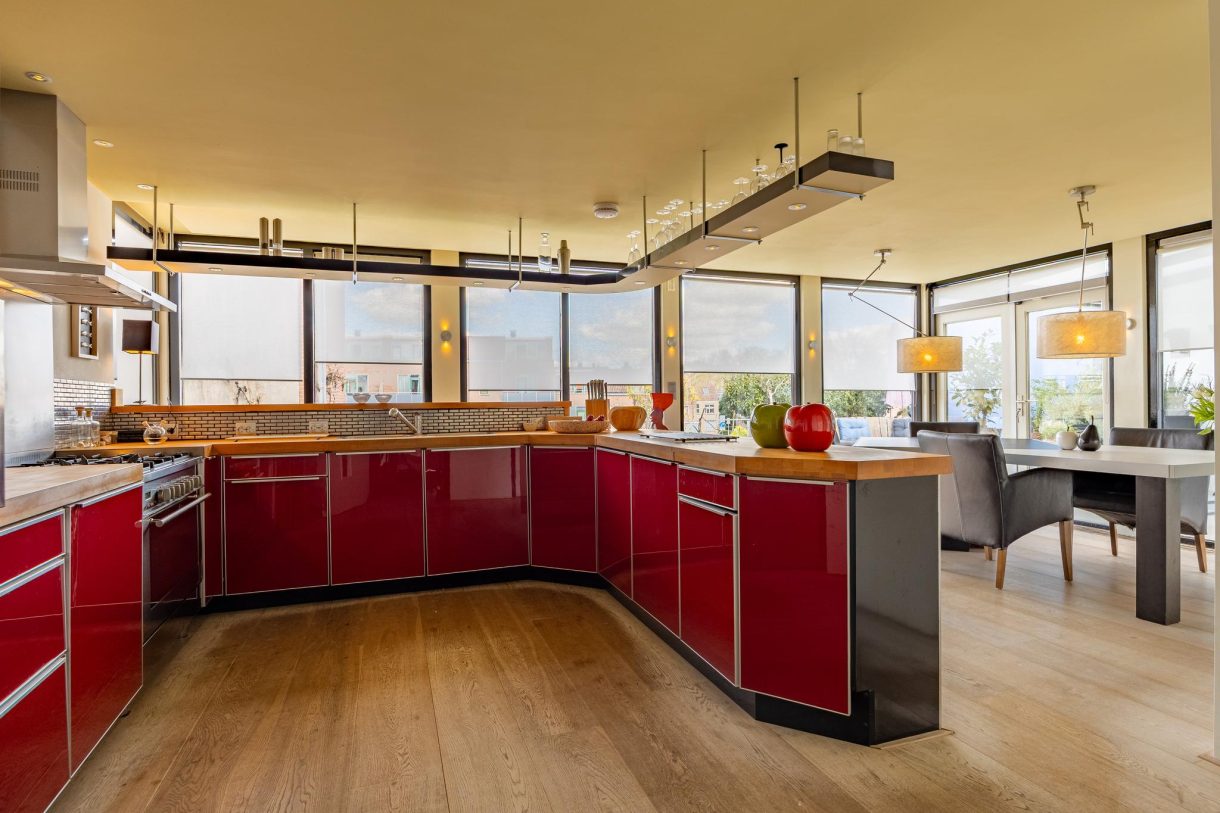 In de leefkeuken is plek voor een grote tafel en de keuken in U-opstelling, met een houten aanrechtblad en een barplank met krukken, is van royaal formaat en blijven achter. Het grote gasfornuis met stoomoven, de afzuigkap, vaatwasser, stoomoven en magnetron en de losse koel-/vriescombinatie blijven achter.