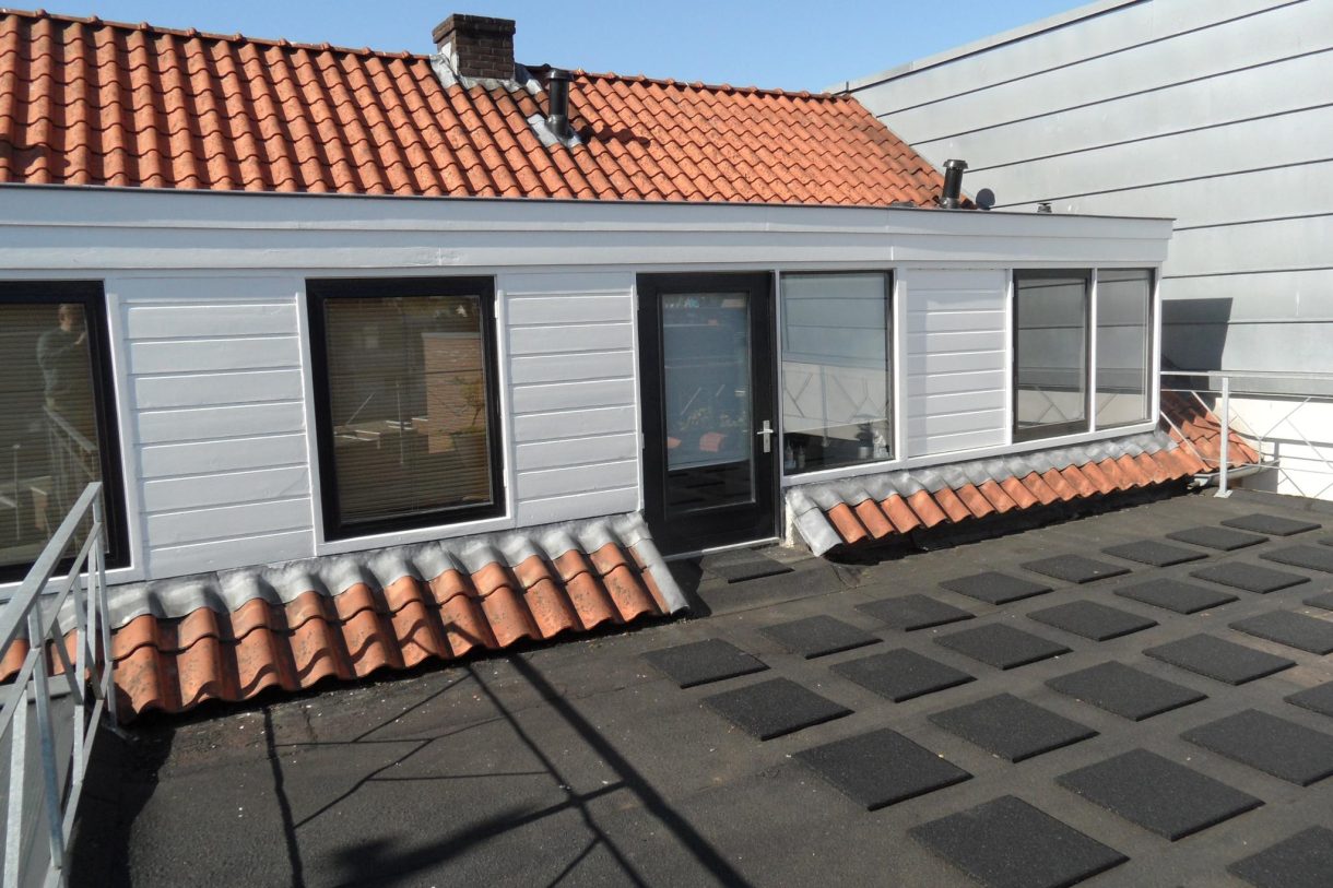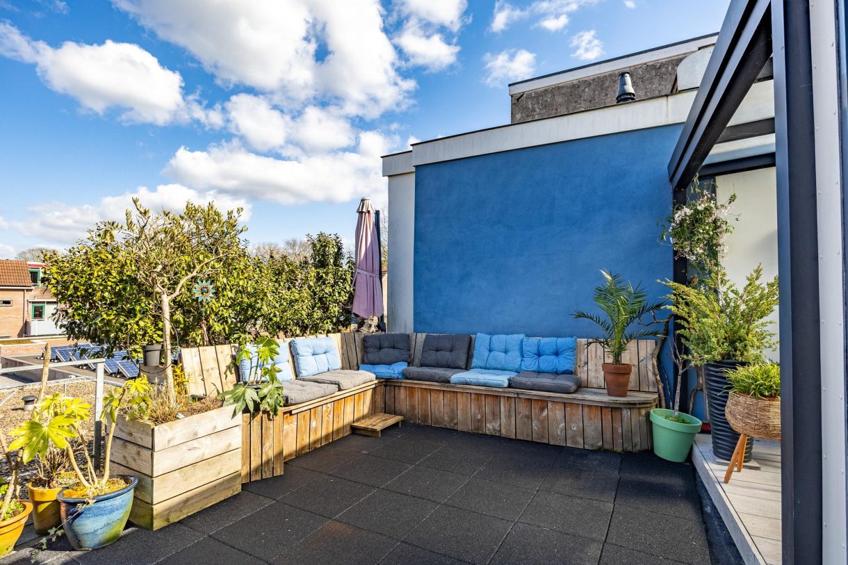 Vanuit de keuken en woonkamer is het royale dakterras te bereiken. Dit is een fantastische plek om buiten te zitten, op de grote maatwerk loungebank of bij de overkapping, waar een tafel met stoelen neergezet kan worden.